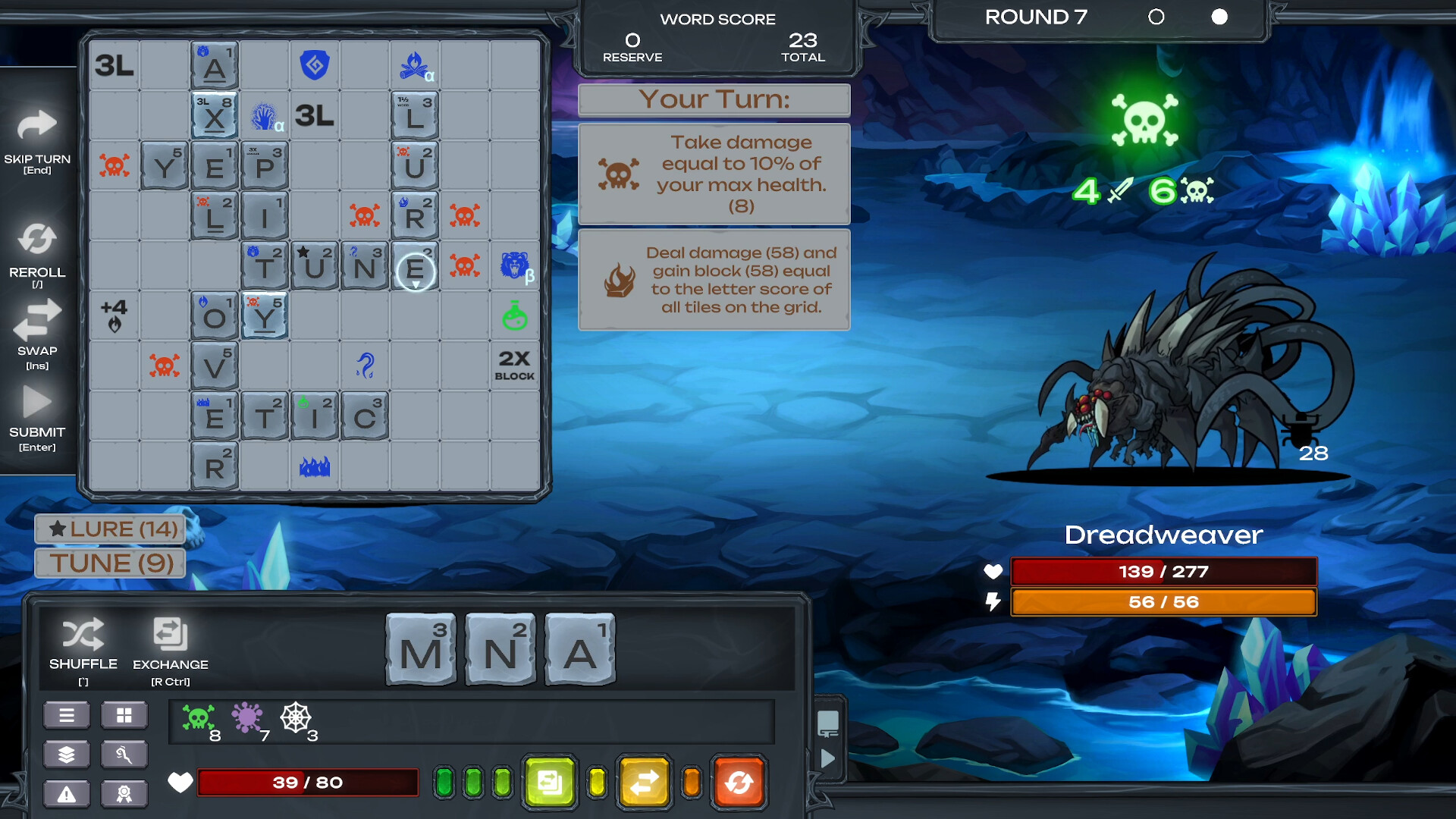 SPELLCAST is a fusion of card battlers and word games. Construct your deck with runes and bonuses, then play words on a grid to use them in battle. The power of your spells changes based on the words and letters you play, making each turn a delicate balance of wizardry and wordplay.
