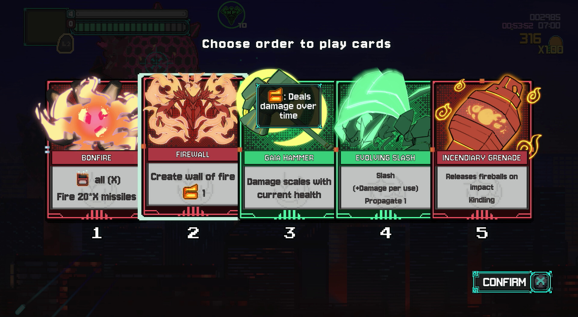 The Final Gambit: Use Hubris to sacrifice health for a massive hand of cards, then unleash Bonfire to burn that entire hand away in exchange for a screen-filling volley of missiles that obliterates everything.