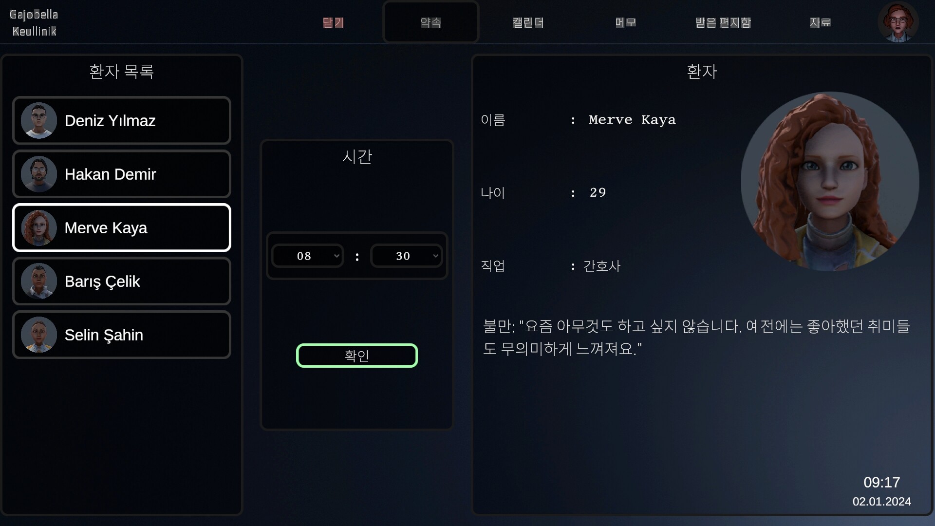 전략적인 예약 및 시간 관리: 여기서 시간은 스톱워치가 아닌 예약 달력으로 측정됩니다. 한 환자를 치료하는 동안, 항상 시계와 다음 예약을 주시해야 합니다. 예를 들어, 오전 8시 환자의 치료를 낮 12시 환자가 도착하기 전에 끝내야 합니다. 그렇지 않으면 다음 환자는 나타나지 않고, 그날의 임무는 실패하게 됩니다. 따라서 어떤 시간에 어떤 간격으로 예약을 잡을지는 전적으로 당신의 전략에 달려있습니다.