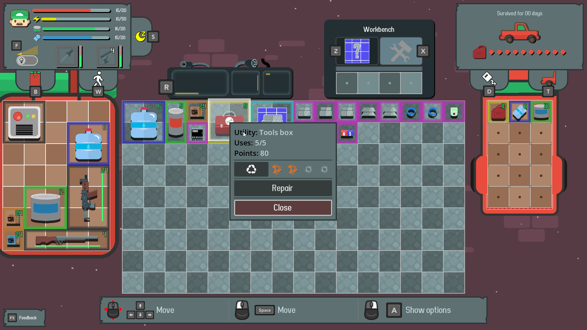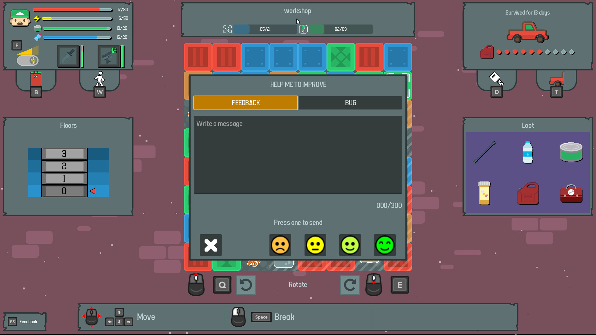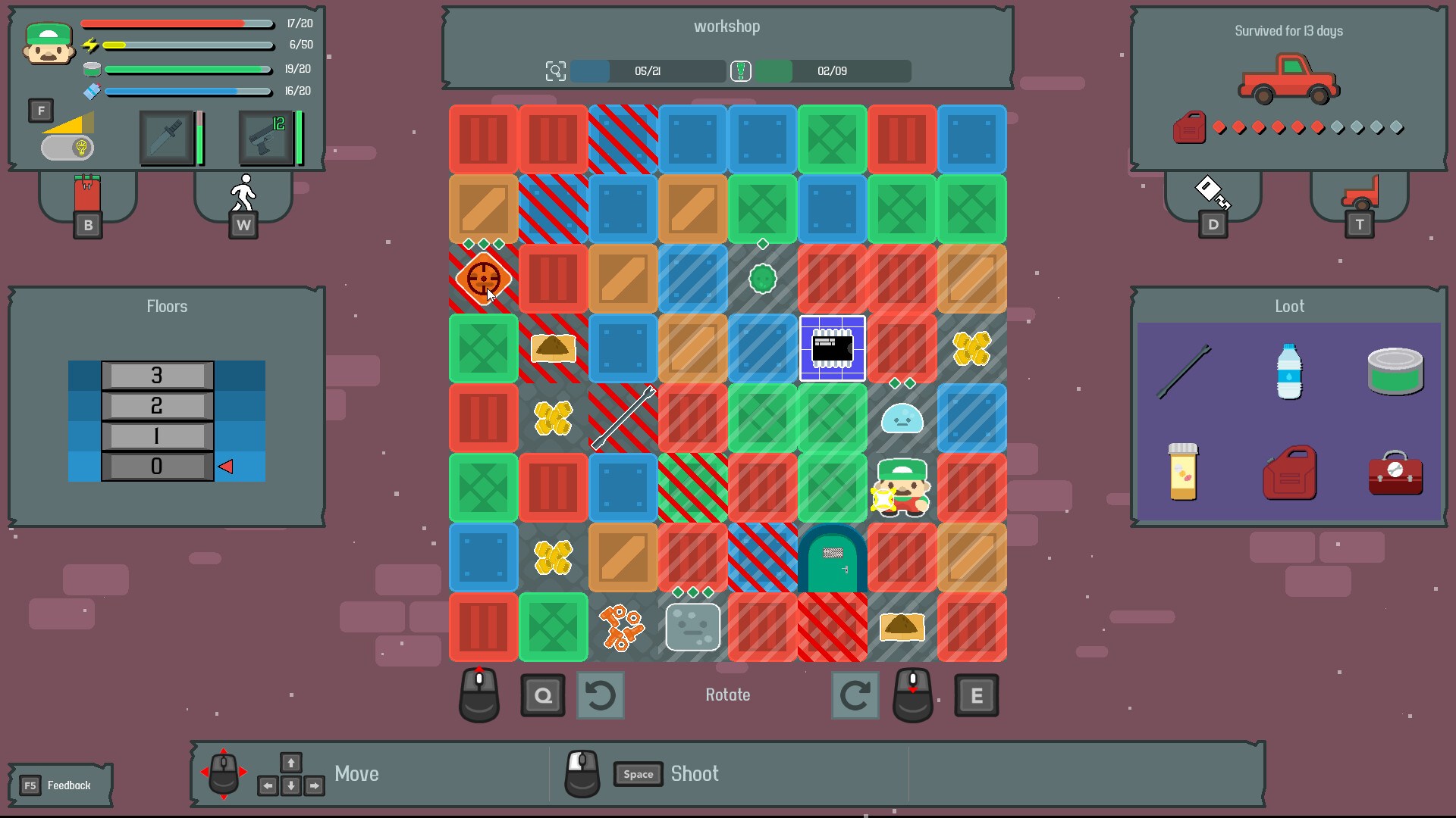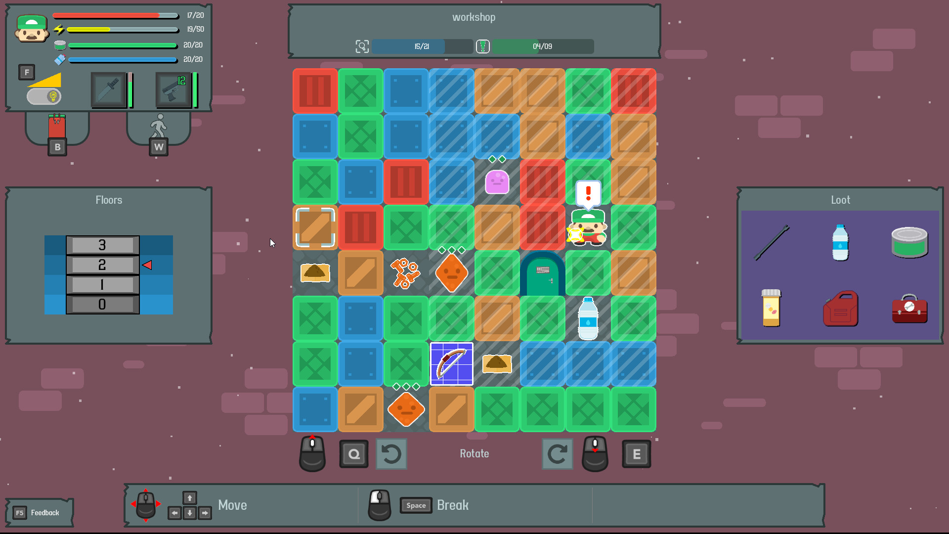 Rotate the grid and break groups of boxes to move your character, loot items and avoid enemies. Explore places with different loot and levels. Recycle items to get materials and craft new ones until you fix the radio and ask for help. A Rogue-lite Survival Explore Looting Crafting game.