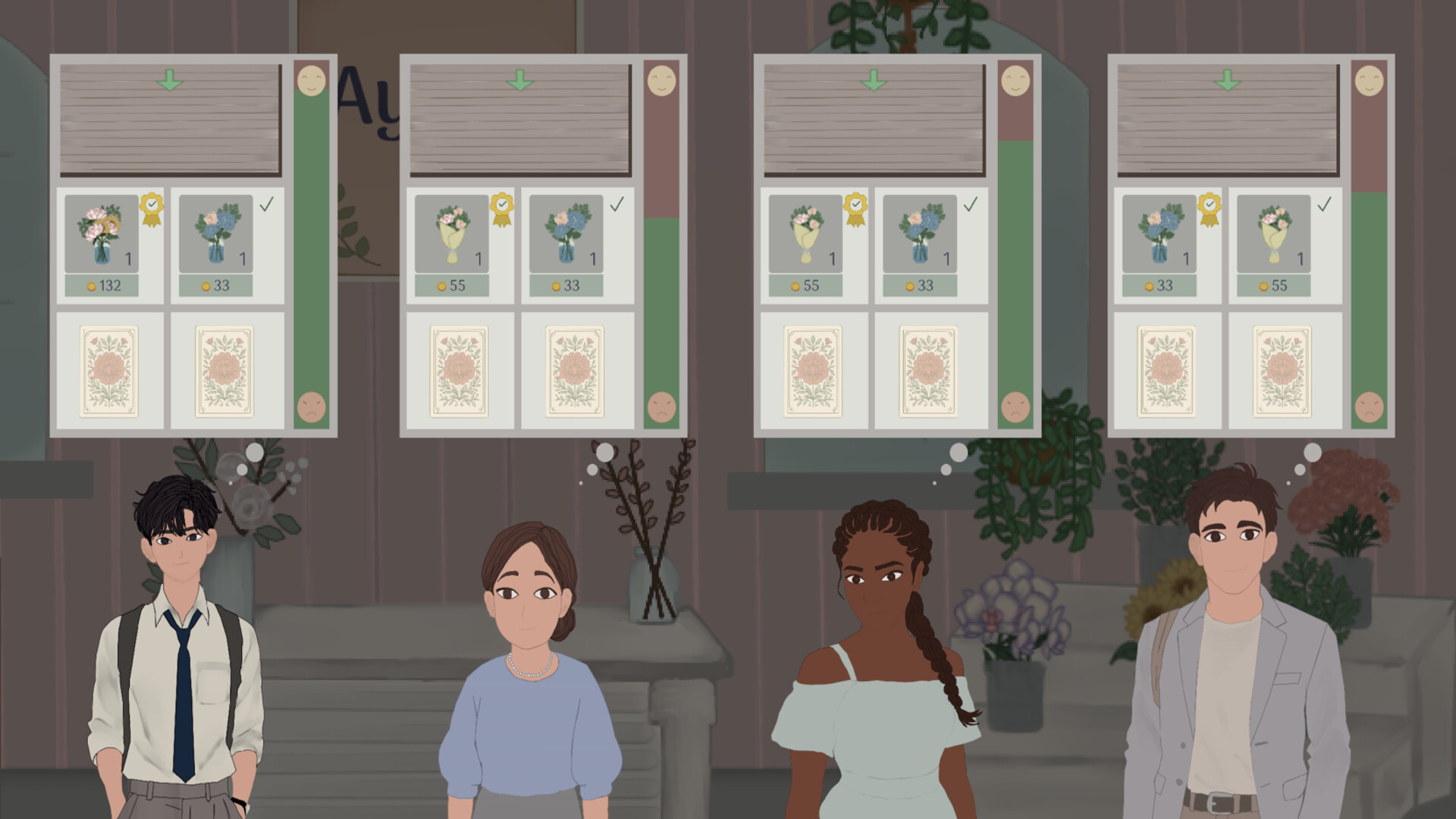 - Turn-based flower shop game play: Every round, use energy to serve, strategize, and react.