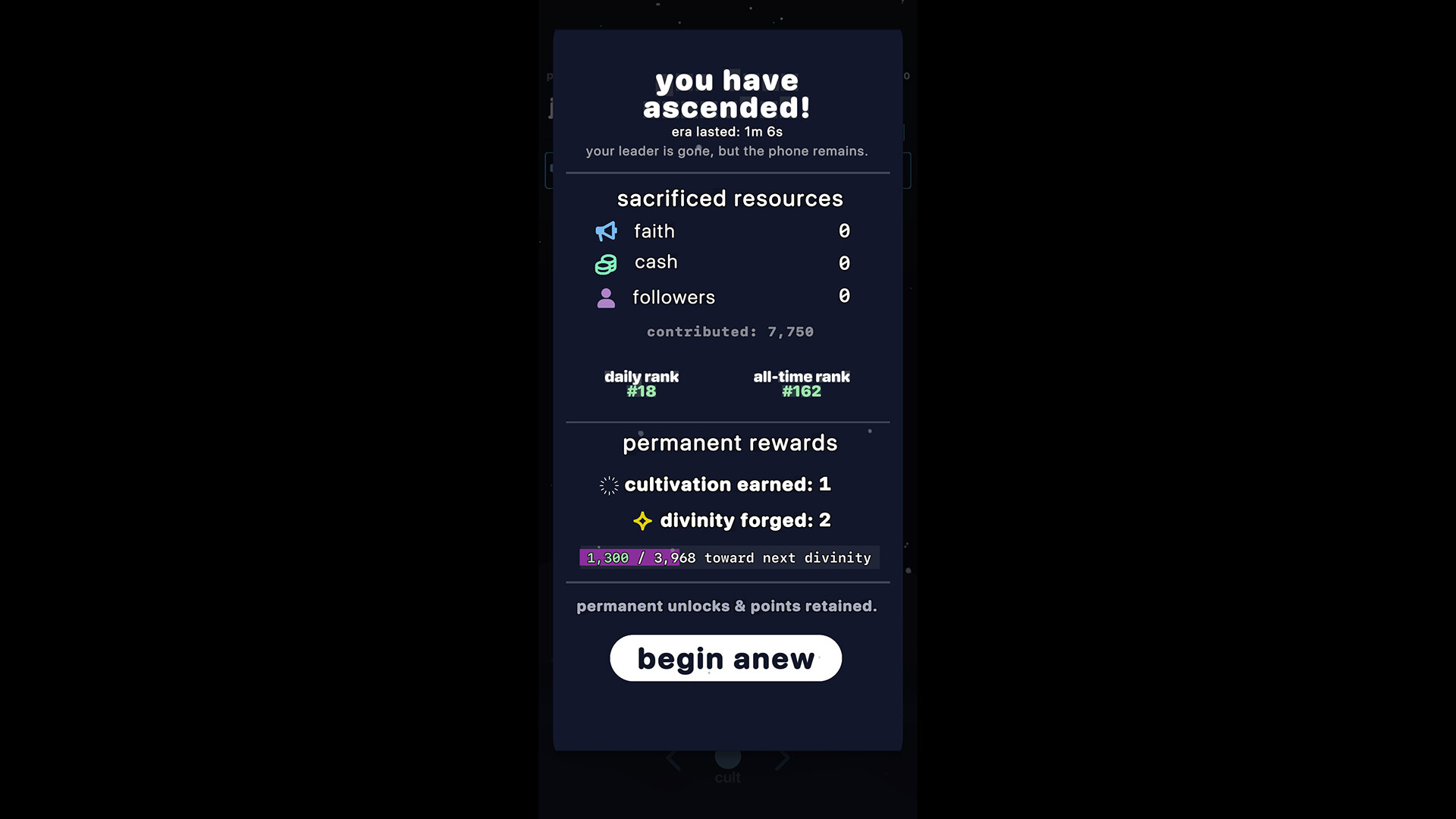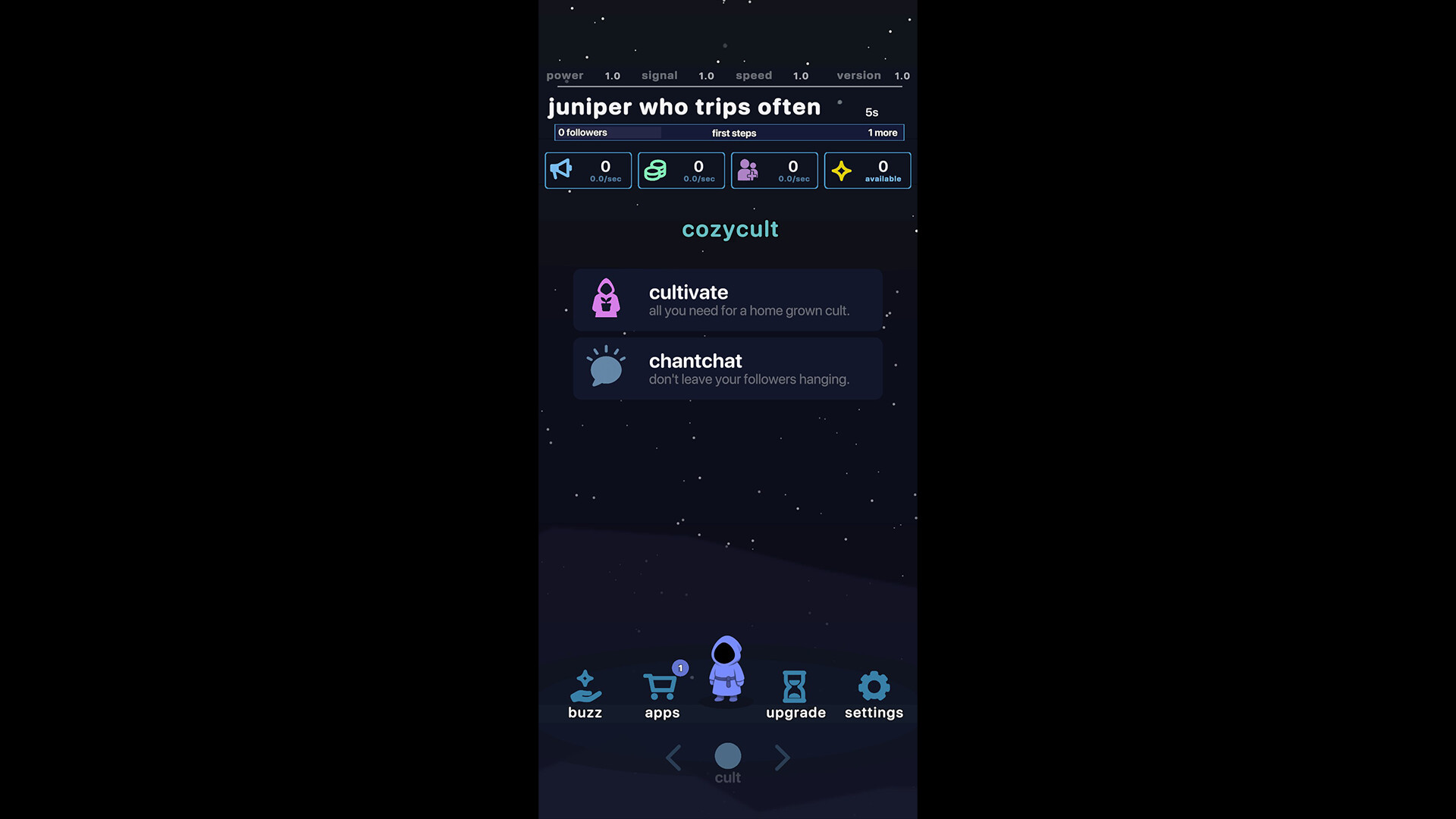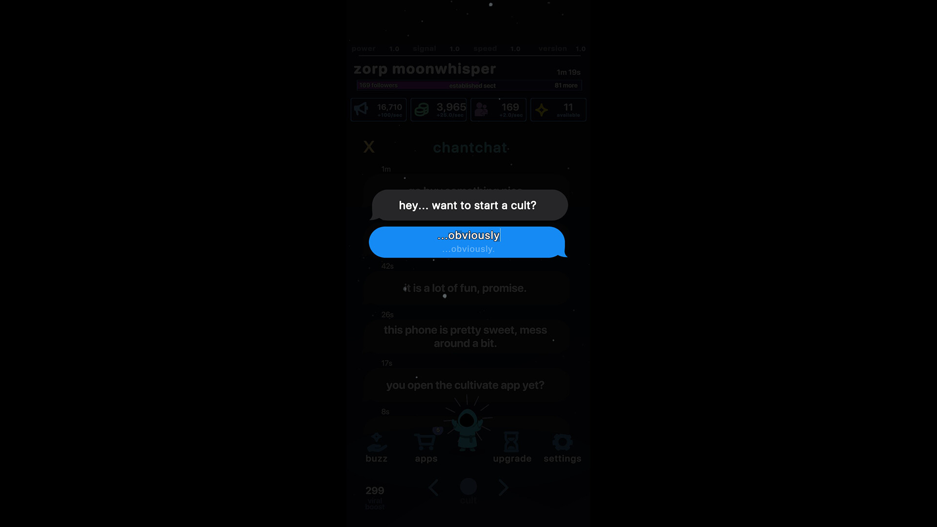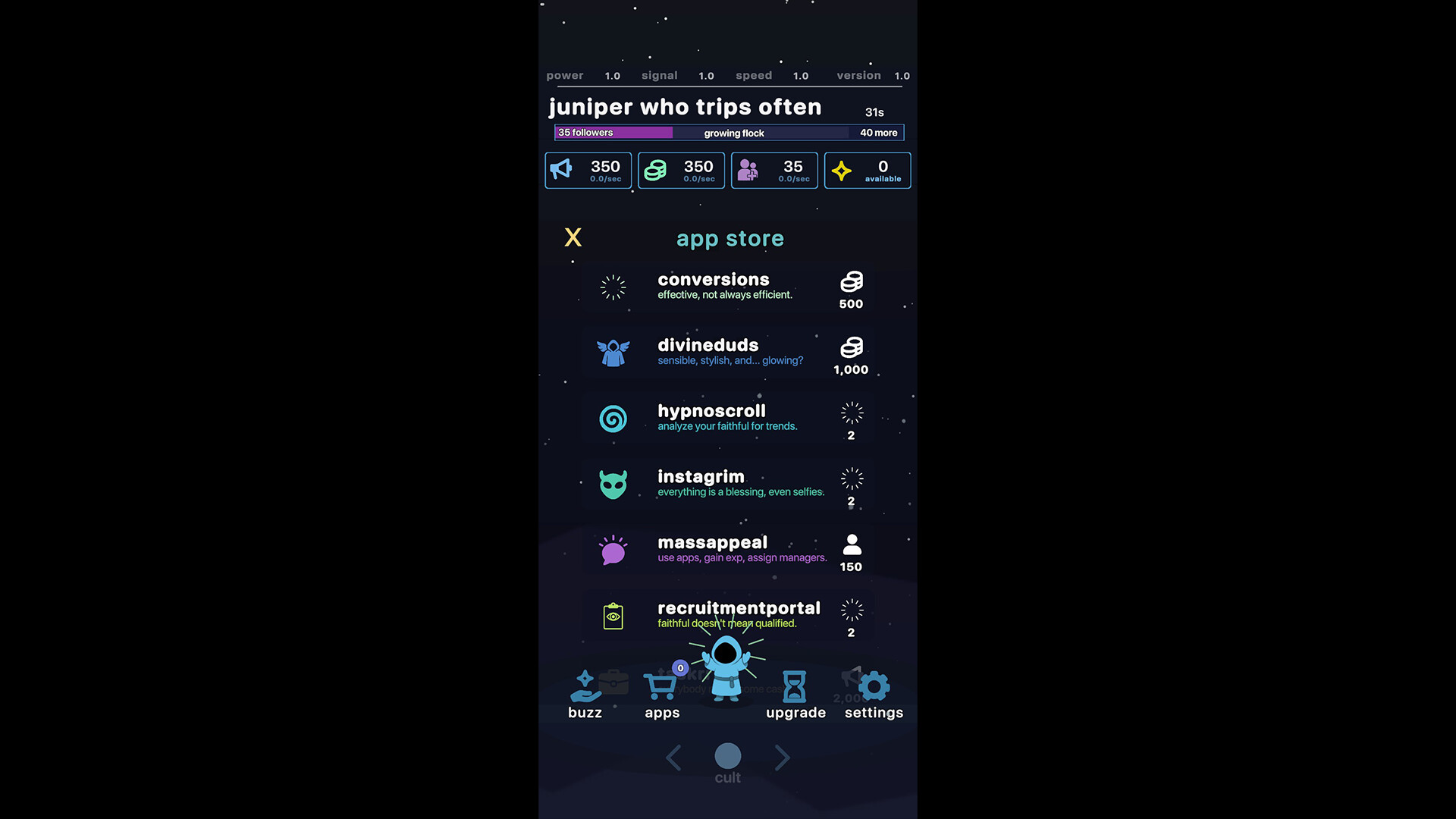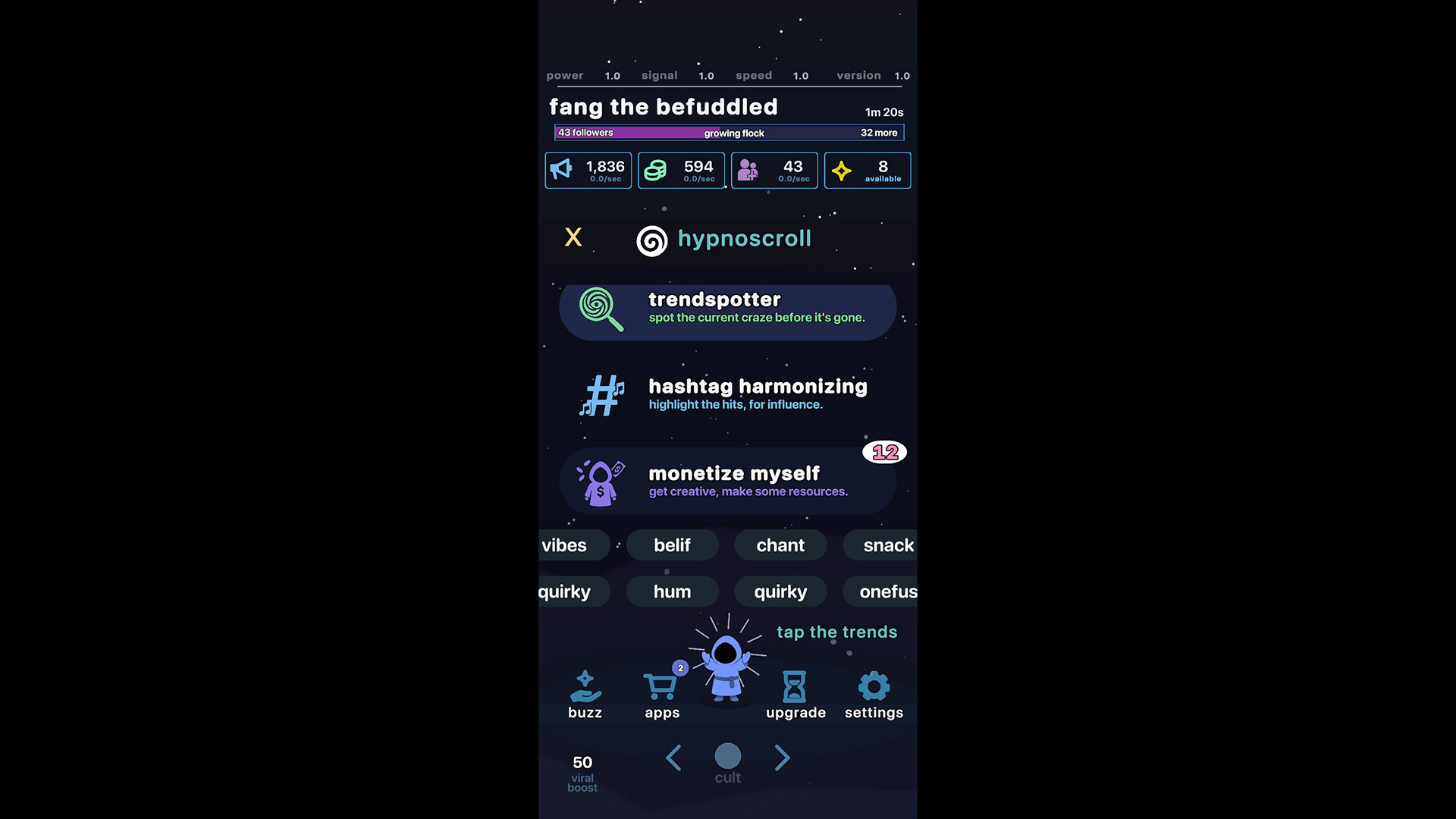 a satirical idle-roguelite demo where you run a cult through social media. download apps, play small minigames, collect followers, and automate everything. ascend for upgrades and let the numbers climb.