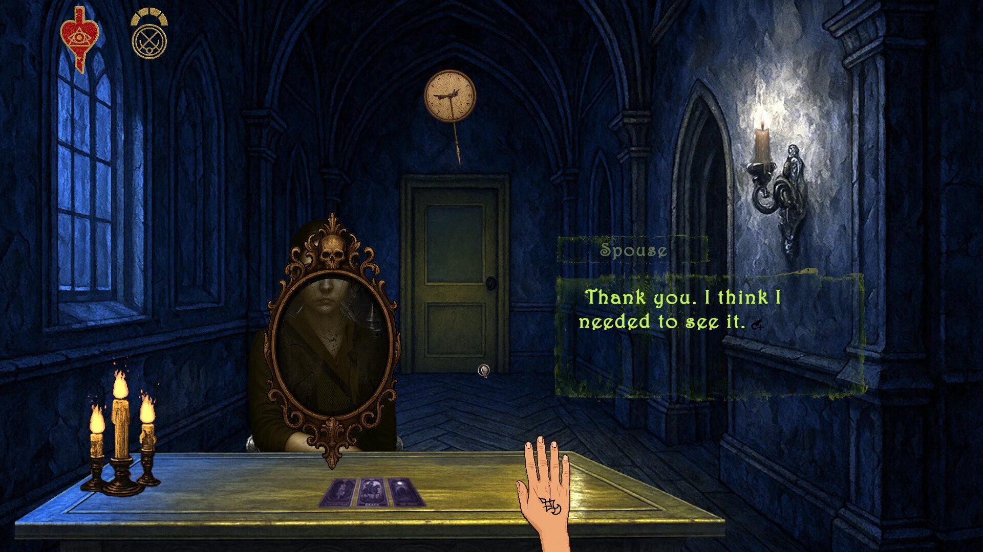You are a ritual specialist, visited by a troubled spouse whose guilt may be hiding something darker. Your role is to read their energy, select your protective accessory, and perform one of several occult bindings to decide their fate.
