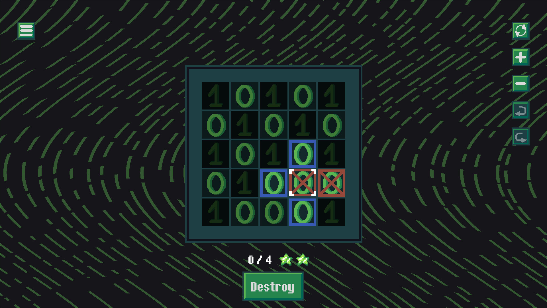 Nullis is a puzzle game where the goal is to destroy zeros from the board. To destroy all of 0-s you must align symbols by getting rid of those below them. Plan your moves ahead or try out different outcomes in order to complete levels with optimal solutions.