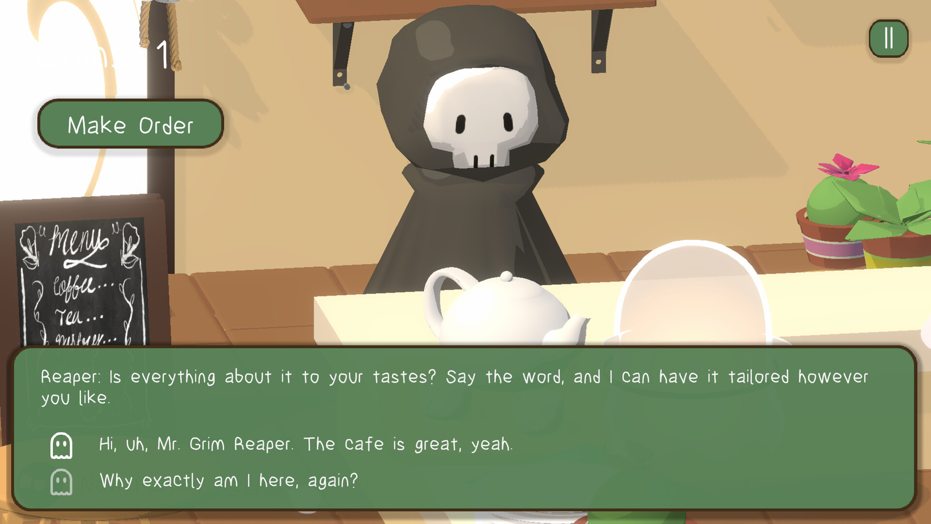 You died... and now you're a ghost! Stranded in purgatory with no idea how to tackle your own issues, you decide to open up a cafe to chat with other ghosts and the grim reaper, and maybe learn a bit more about yourself! You can be free from purgatory only if you've finally found peace in the life you lived after all...