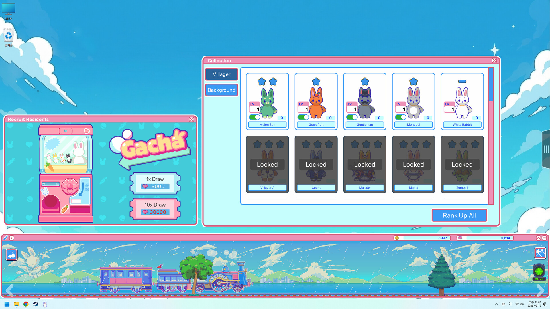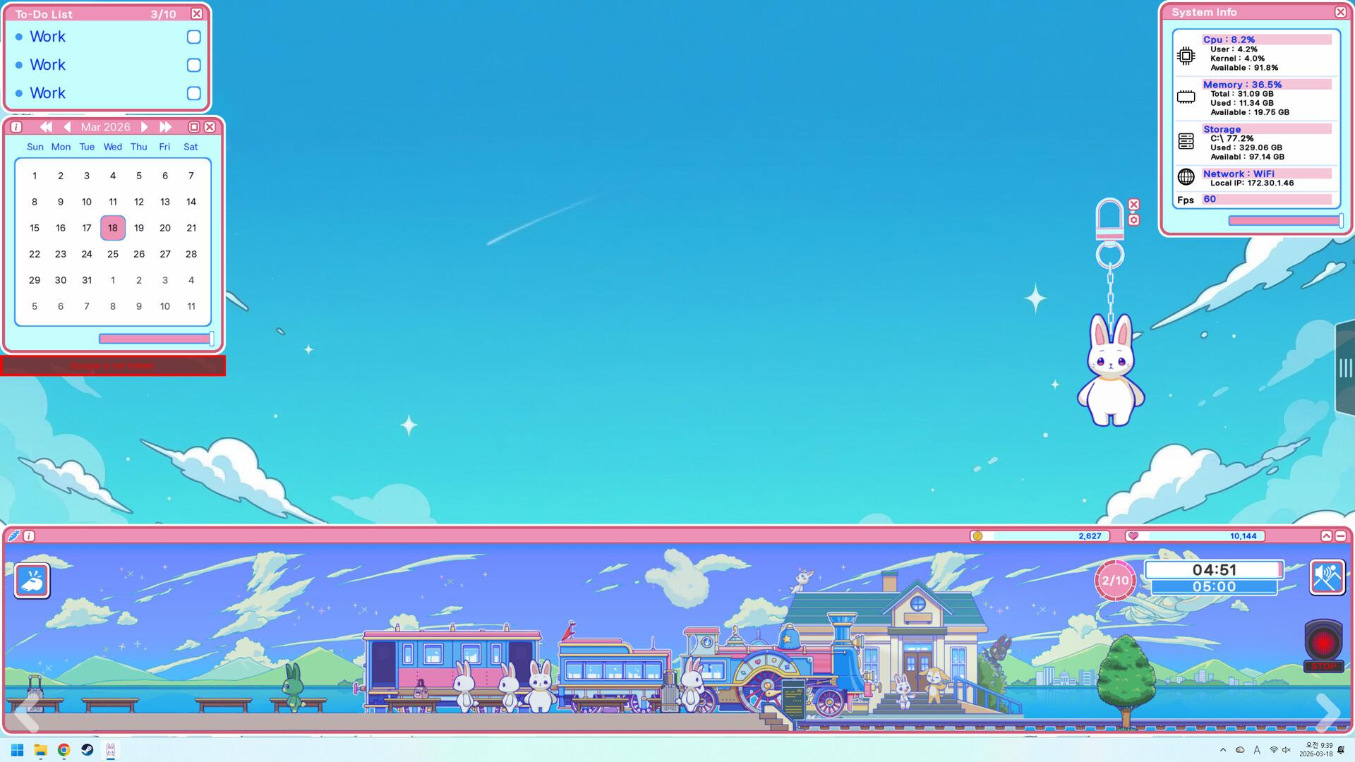 Pomodoro 타이머와 귀여운 토끼 마을이 만난 방치형 데스크탑 악세서리 게임. 기차가 출발하고 도착하는 동안 손님을 태우고 코인을 모아 업그레이드와 스킨을 즐기세요.