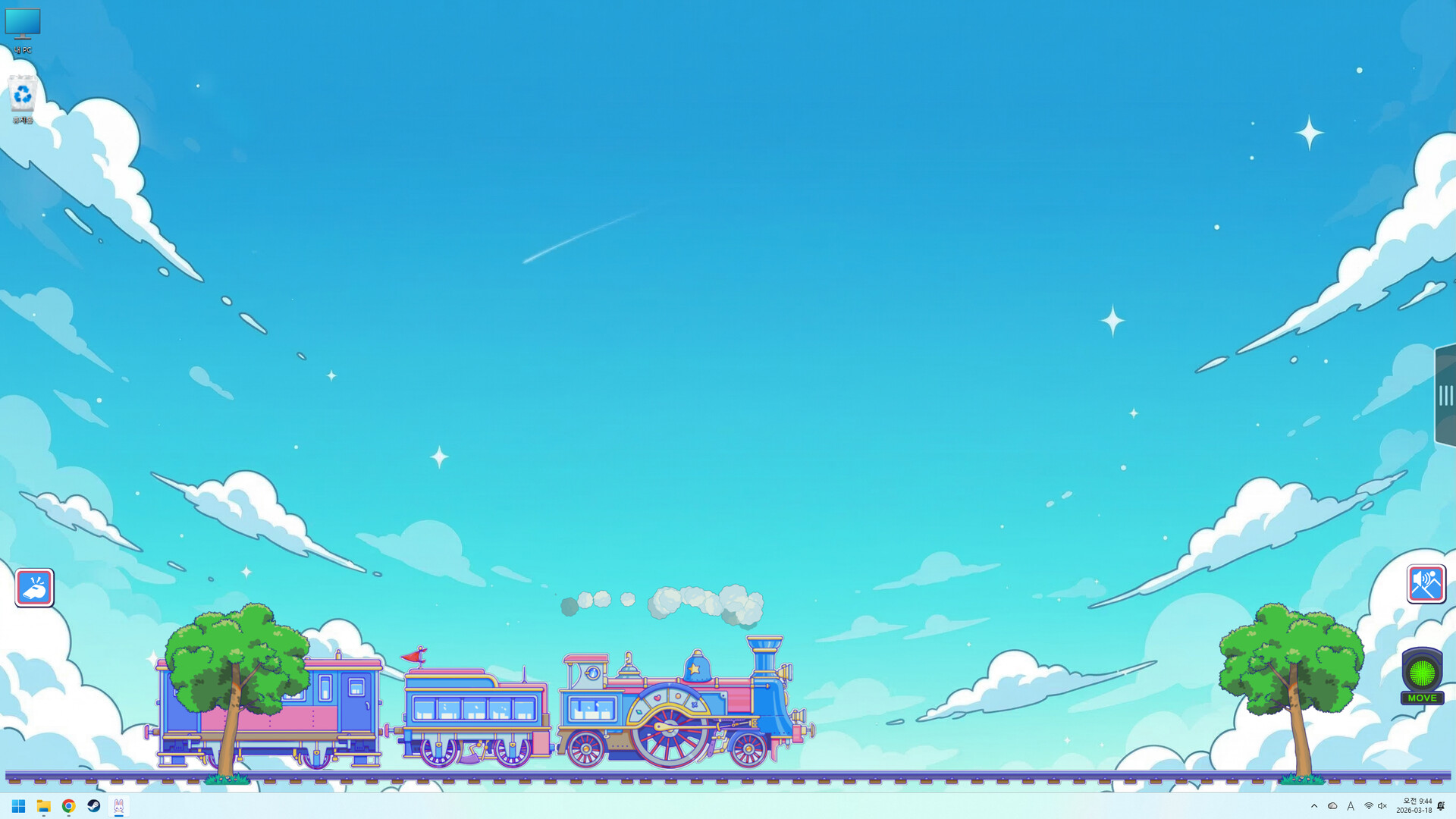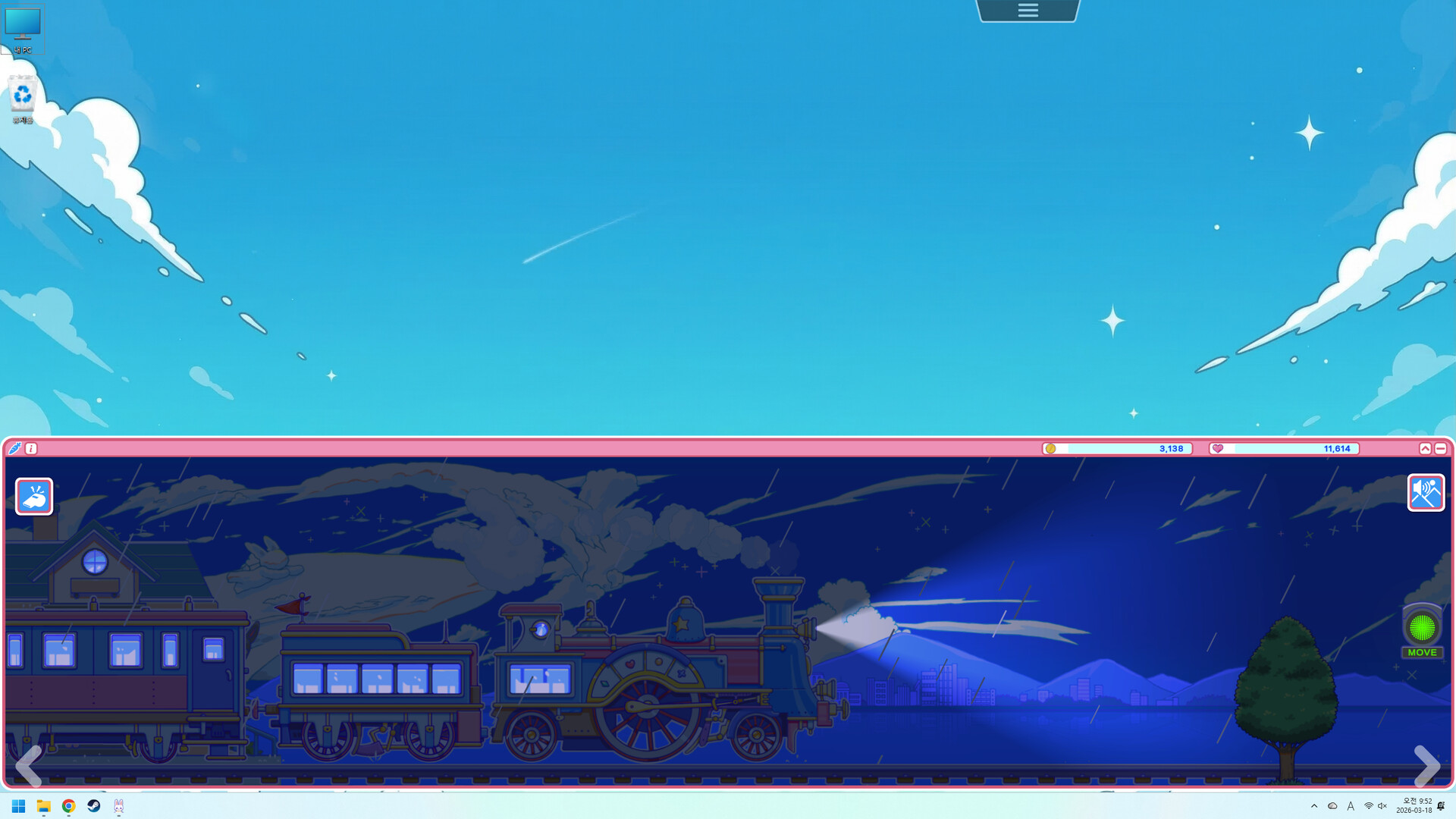 귀여운 토끼들이 여행하는 것을 보며 나도 같이 일할 수 있는 게임. 컴퓨터로 일하며 틈틈히 토끼들을 구경하고 기차를 관리하고 일에 집중할 때는 토끼들도 일 시켜놓고~ 배경도 내 마음대로 설정할 수 있지만 시간별로 자연스럽게 바뀌도록 설정해놓을 수 있어서 시간의 흐름을 즐길 수 있네요. 아침에는 너희도 출근하고 저녁에는 같이 퇴근하자.. 피로도를 100%까지 채워봤는데, 시간마다 주는 재화만 좀 줄어들고 그렇게까지 불편한 건 없네요. 그냥 열심히 토끼들 기차 여행 시키면 되겠어요. (마음놓고 방치하기) 배경효과 별로 소리를 줄이고 키울 수 있어 편리해요. 소리를 작게 줄여서 asmr처럼 즐기거나 아예 소리를 끄고 배경효과만 즐길 수도 있어서 취향대로 즐길 수 있을 것 같아요. 기차가 출발할 때 나는 소리도 귀여워요ㅎㅎ 이벤트 스킨창에 있는 나무들도 나중에 계절별로 추가가 될까요? 단풍나무나 눈이쌓인 나무도 추가되길 기대해봅니다! 아직 많이 해보지는 못 했지만 일단 귀엽다는 것만으로도 굿굿.(가격도 저렴! 커피 한 잔 값에 토끼구경하기. 은근 디테일있음.) 방치형 게임은 익숙하지 않아서 자꾸만 토끼들을 확인하고 싶은데 꾹 참고 느긋하게 즐겨보겠습니다.