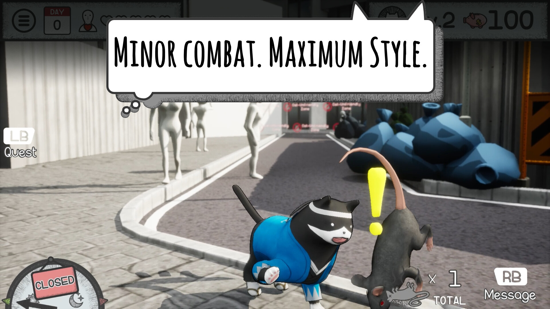 • 퀘스트를 완료하고 쥐들과 싸우며 동네를 정화하세요