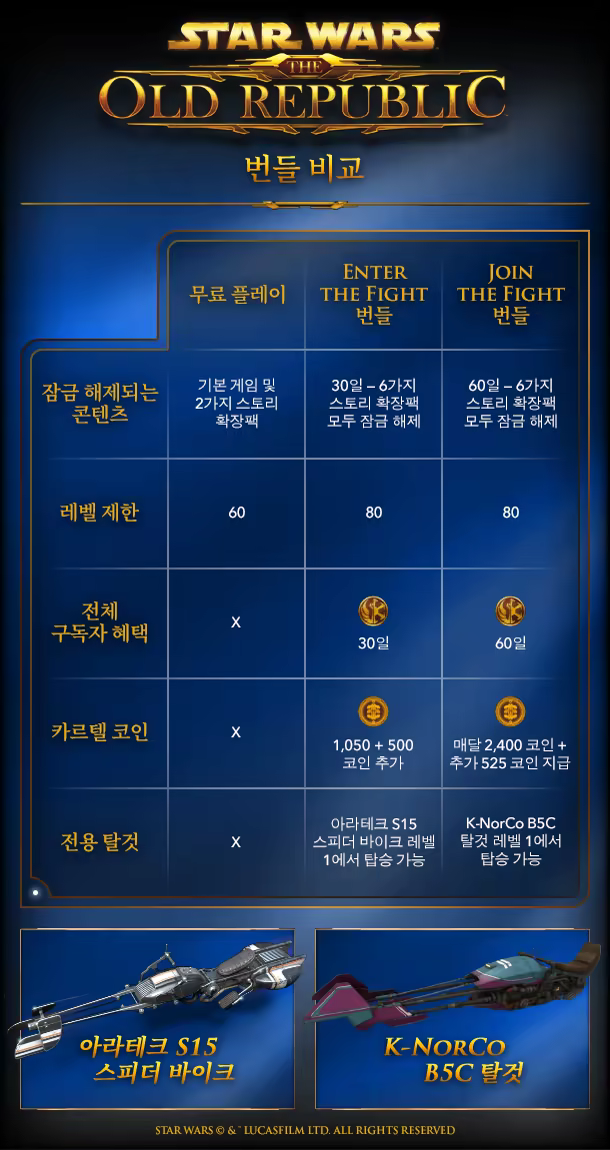 30일 구독 번들을 통해 여정을 시작하세요. 번들에는 카르텔 코인 1,050개와 독점 S15 정찰용 탈것이 포함되어 있습니다! 이 탈것은 레벨 1에서 탑승할 수 있으며, 은하계를 빠르게 누비며 오리진 스토리부터 시스의 유산 확장팩까지 원하는 길을 선택할 수 있도록 도와줍니다.