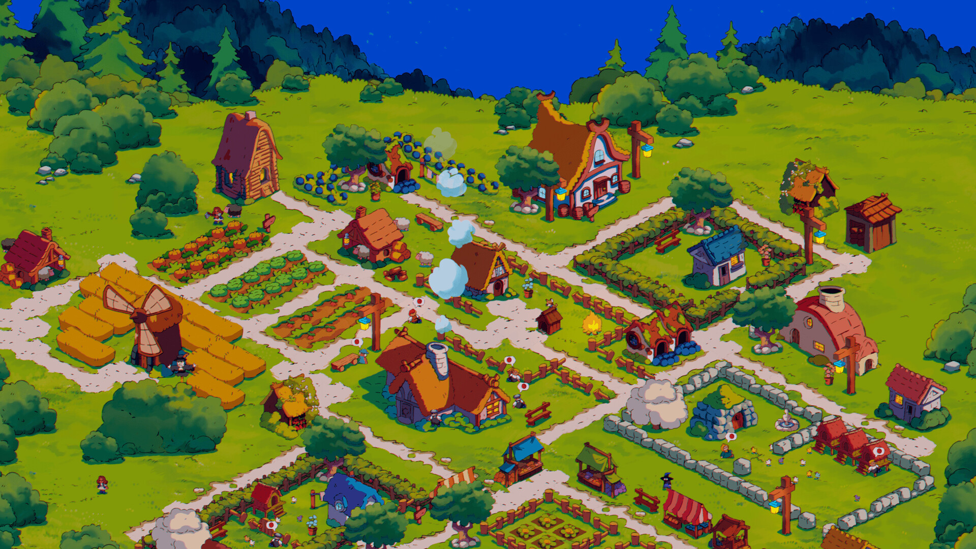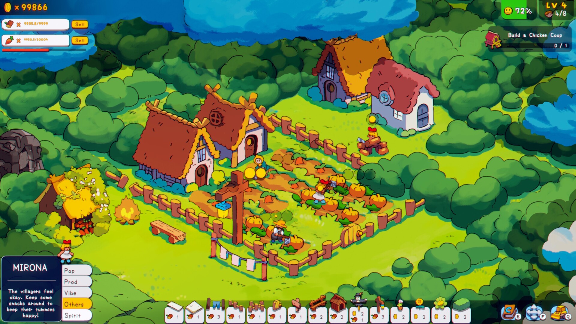 Spirits - Unlock spirits through playful world interactions (cook a chicken to summon Peppok, destroy a bush, or even make a villager fly!). Spirits lend their magic to help manage your growing town.
