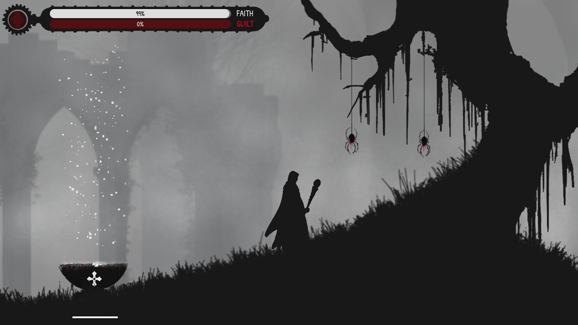 Gameplay centers on the constant dilemma of Guilt and Faith, represented in two interconnected bars that define your moral and spiritual state.