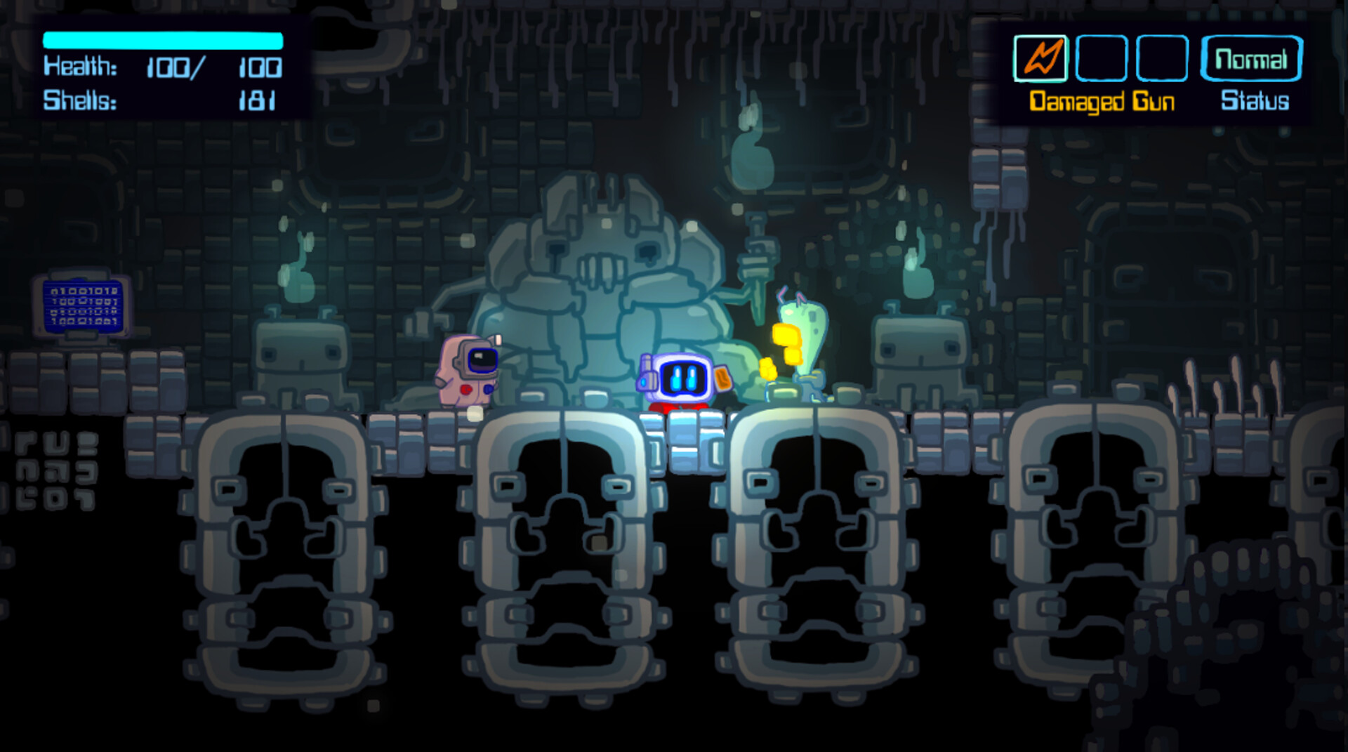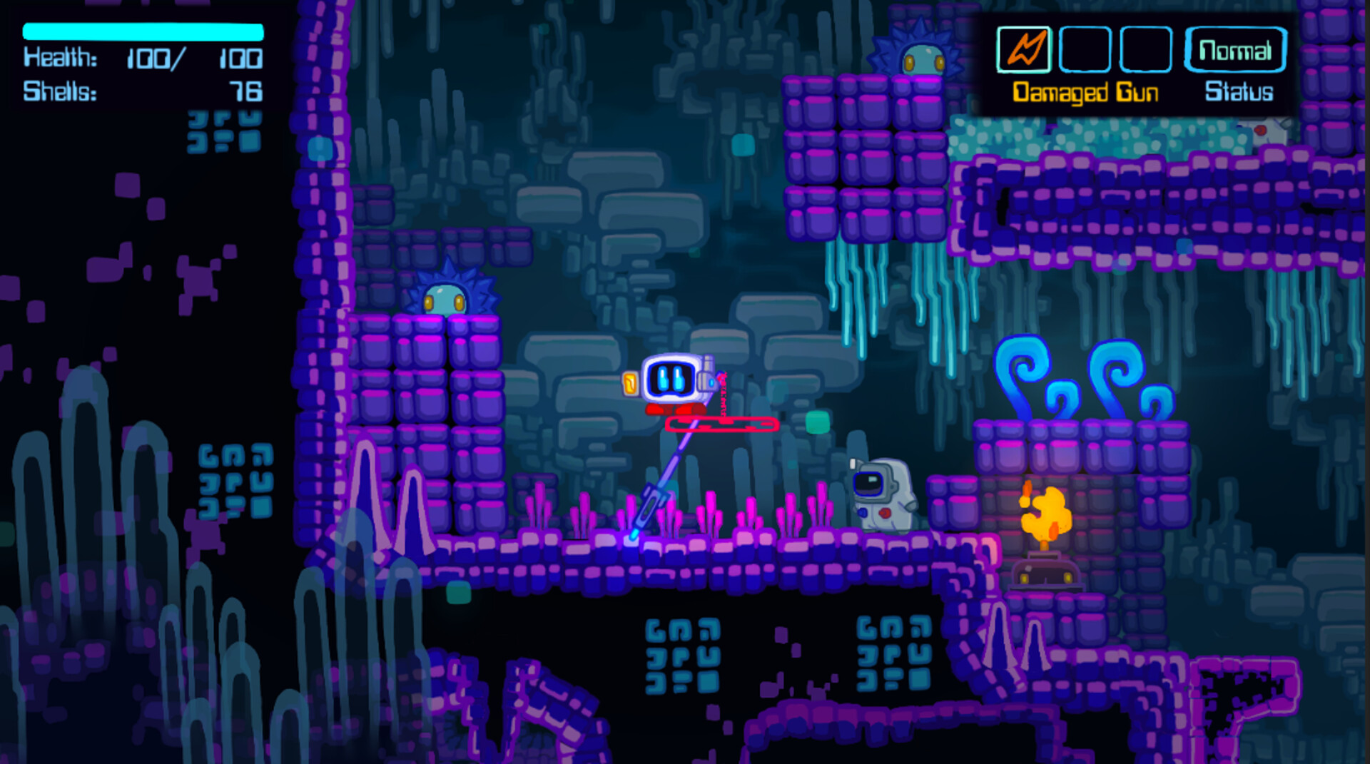 Crash-landed on a fungus infested planet, Cubit the robot must find its path through fighting alien creatures and navigating through an increasing hostile world with a platform creation gun in sci fi inspired dark but cute Metroidvania platforming game.