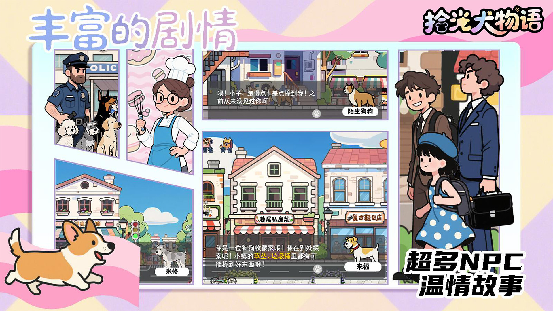 在一片被暖阳与绿荫环抱的土地上,坐落着一座名为 “拾光镇” 的奇妙小镇。生活在小镇中的狗狗们各个都是收藏家,探索小镇收集稀有收藏品的同时,逐渐了解狗狗们过去的故事。这是一个连风都裹挟着温馨的地方,每一寸土地都记录着人们与狗狗之间的温情故事。 超多超有梗的稀有收藏品,等你在小镇的大街小巷发现。 剧情+解密温情时刻:主线+支线多种解密元素融入场景和剧情,超多NPC,感受人与动物的温情瞬间。 装扮+经营治愈体验:从零打造温馨狗窝,经营餐厅成为大厨,超多配饰装扮个性狗狗。