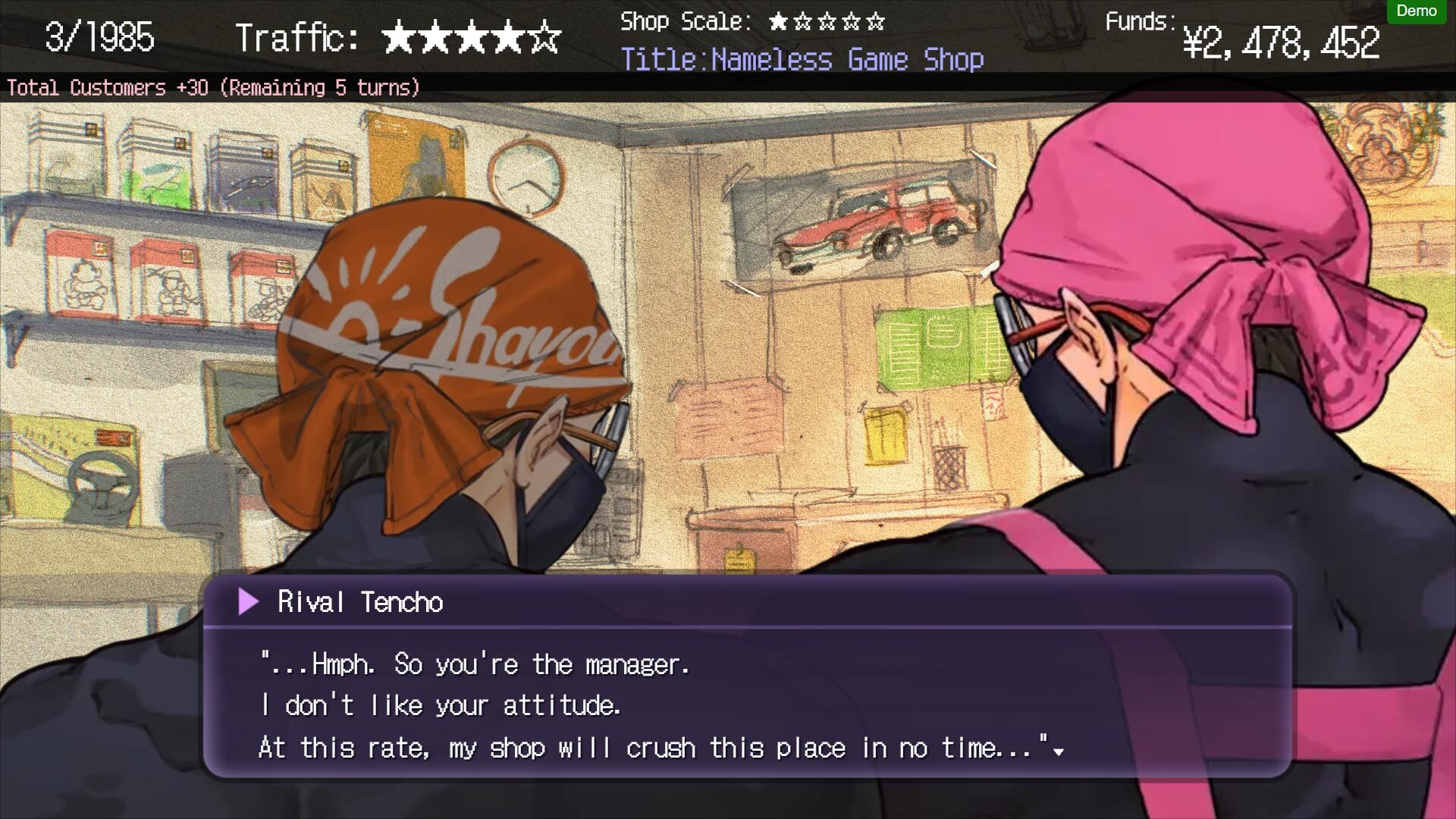 Manage your dream game shop through gaming history, starting from 1985. This demo covers the first three years of the iconic Famicom boom. Can you survive the dawn of Japan's biggest gaming shifts in this management simulation?