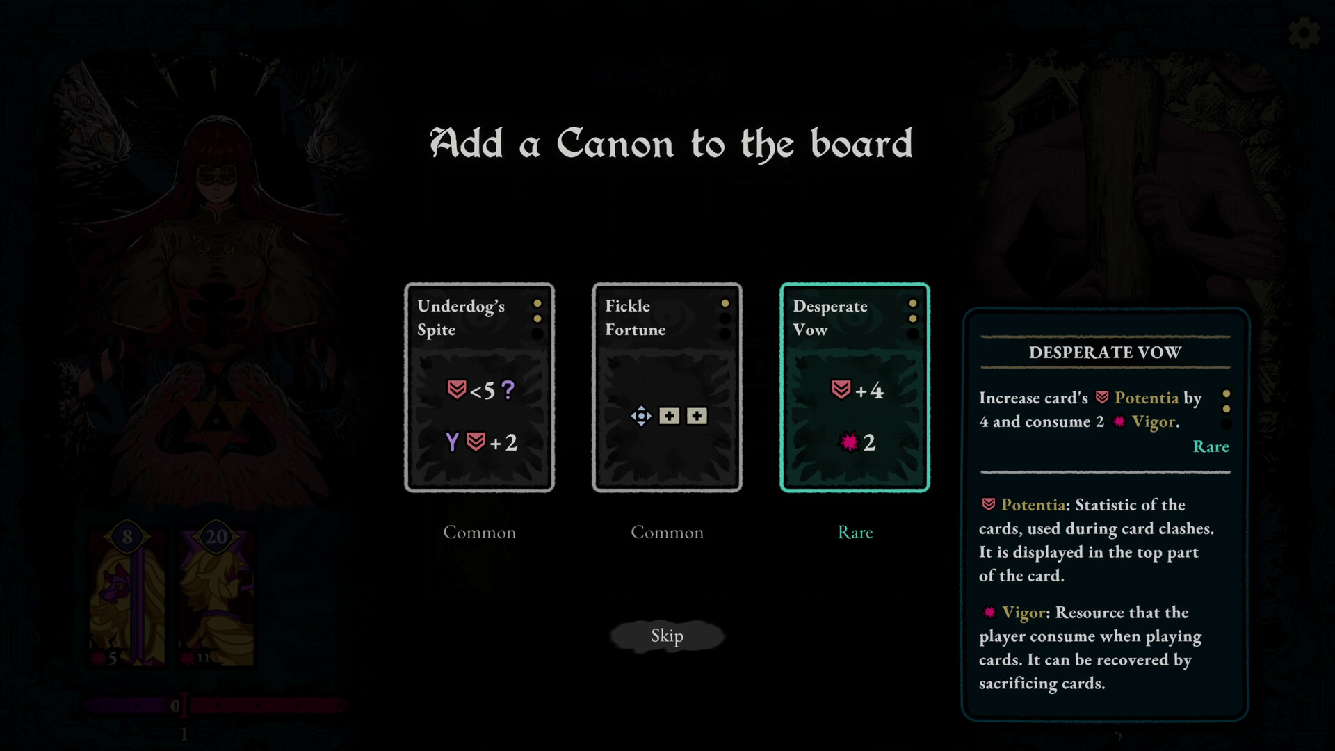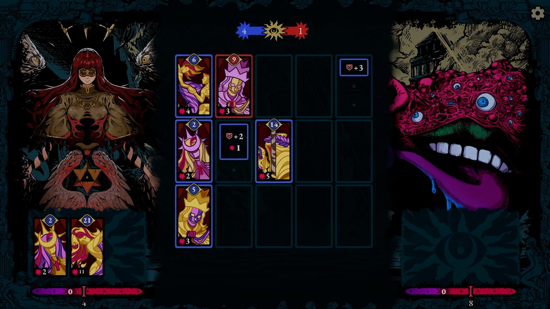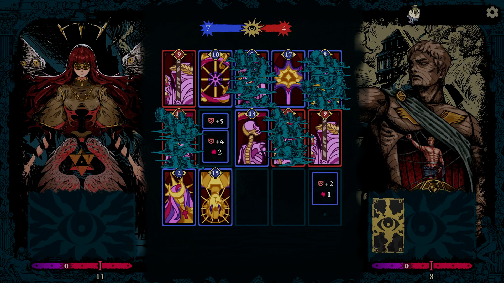 Triple Triad와 Othello의 공간 논리에서 영감을 받은 이 게임에서, 모든 카드 배치는 영토를 차지하기 위한 고도의 도박입니다. 적을 가로, 세로, 대각선으로 포위하여 '카드 격돌(Card Clash)'을 유도하고, 망자들과 Custos("수호자")를 상대로 당신의 카드가 가진 Potentia("권능")를 시험하십시오. 격돌에서 승리하여 적 유닛을 당신의 편으로 뒤집고, 그들의 힘을 역이용해 보드를 장악하십시오. 단 한 번의 영리한 수가 처참한 패배를 완벽한 승리로 바꿀 수 있습니다.