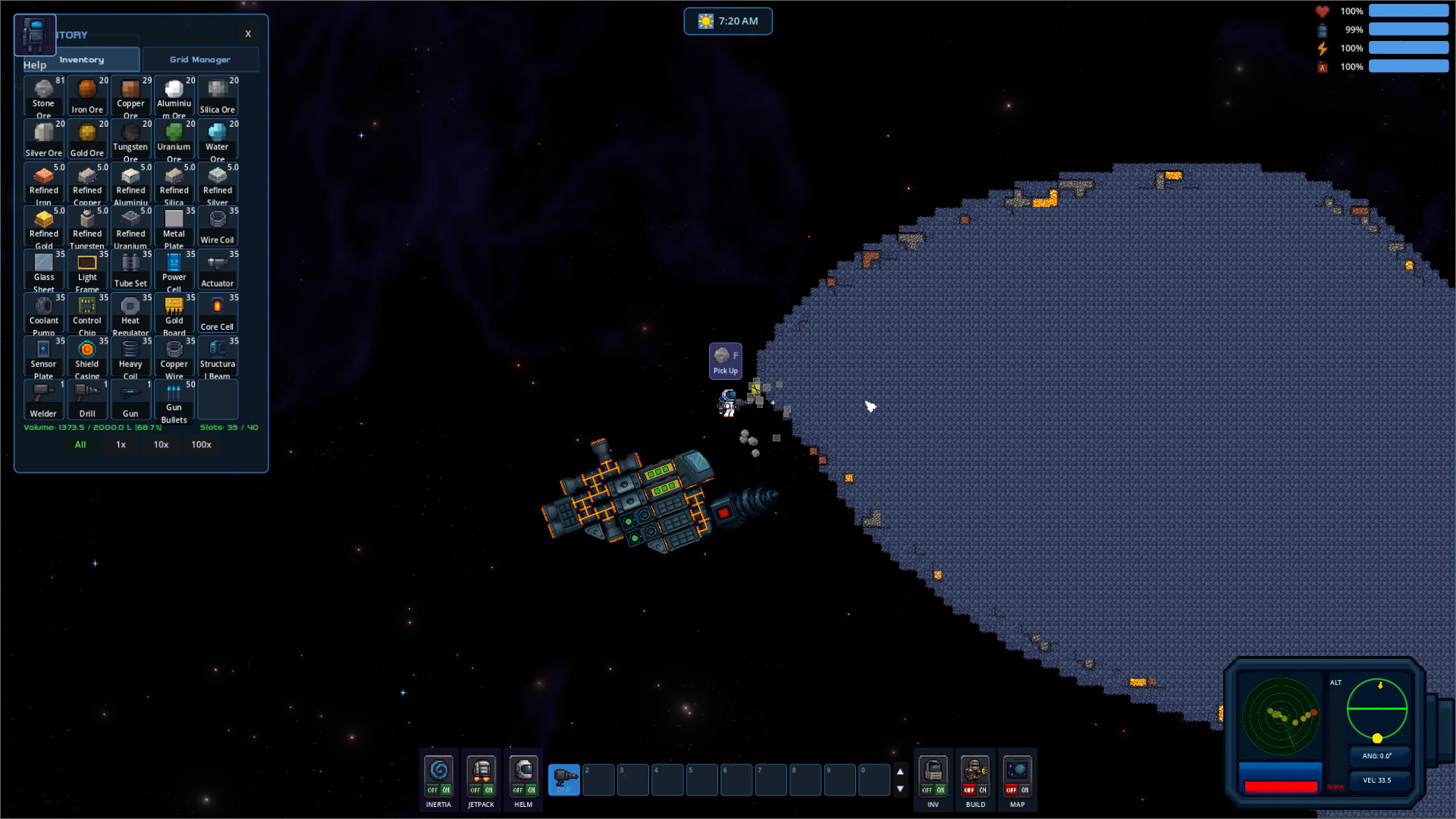 Unlock and place functional blocks that give your ship personality and purpose. Add thrusters, refineries, storage, weapons, and more. Upgrade your designs as you discover better materials.