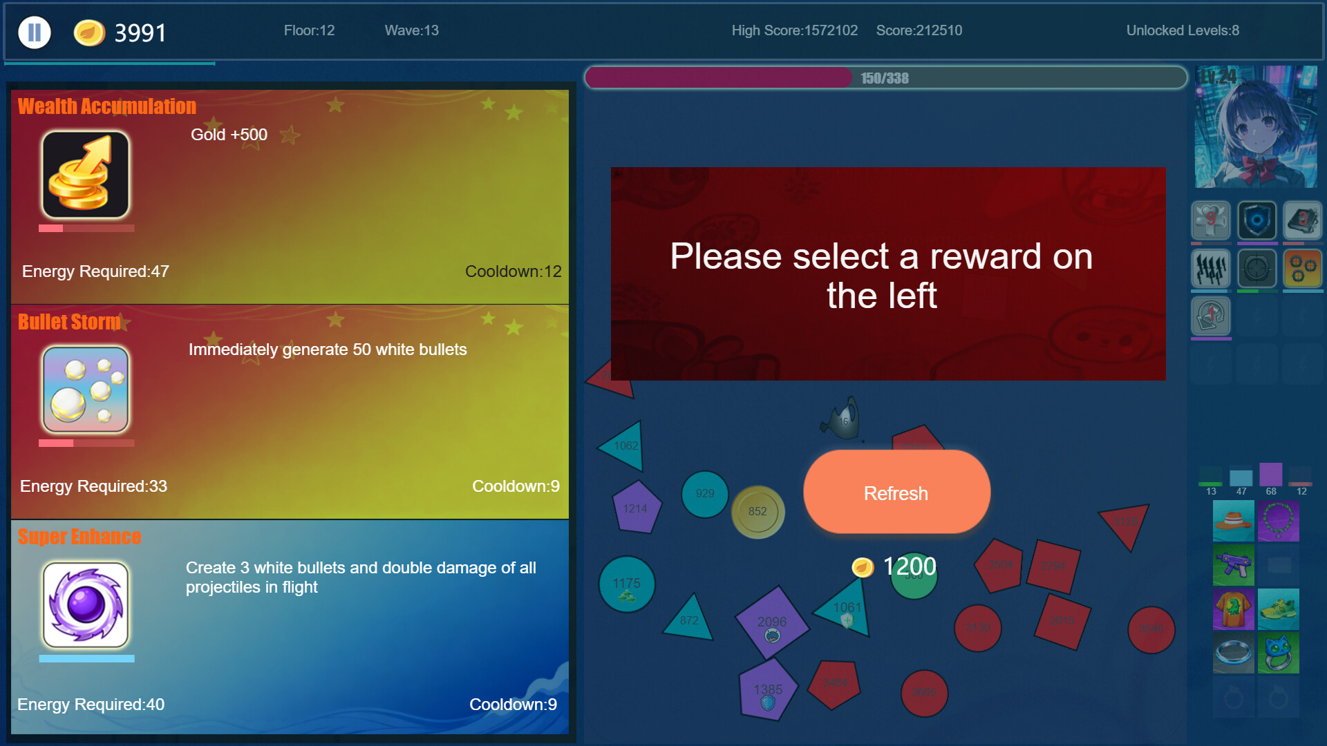 업그레이드 시 한 가지 스킬을 선택할 수 있으며, 최대 12개의 스킬까지 선택할 수 있습니다. 스킬의 소모량과 쿨다운에는 일정한 무작위성이 있습니다.