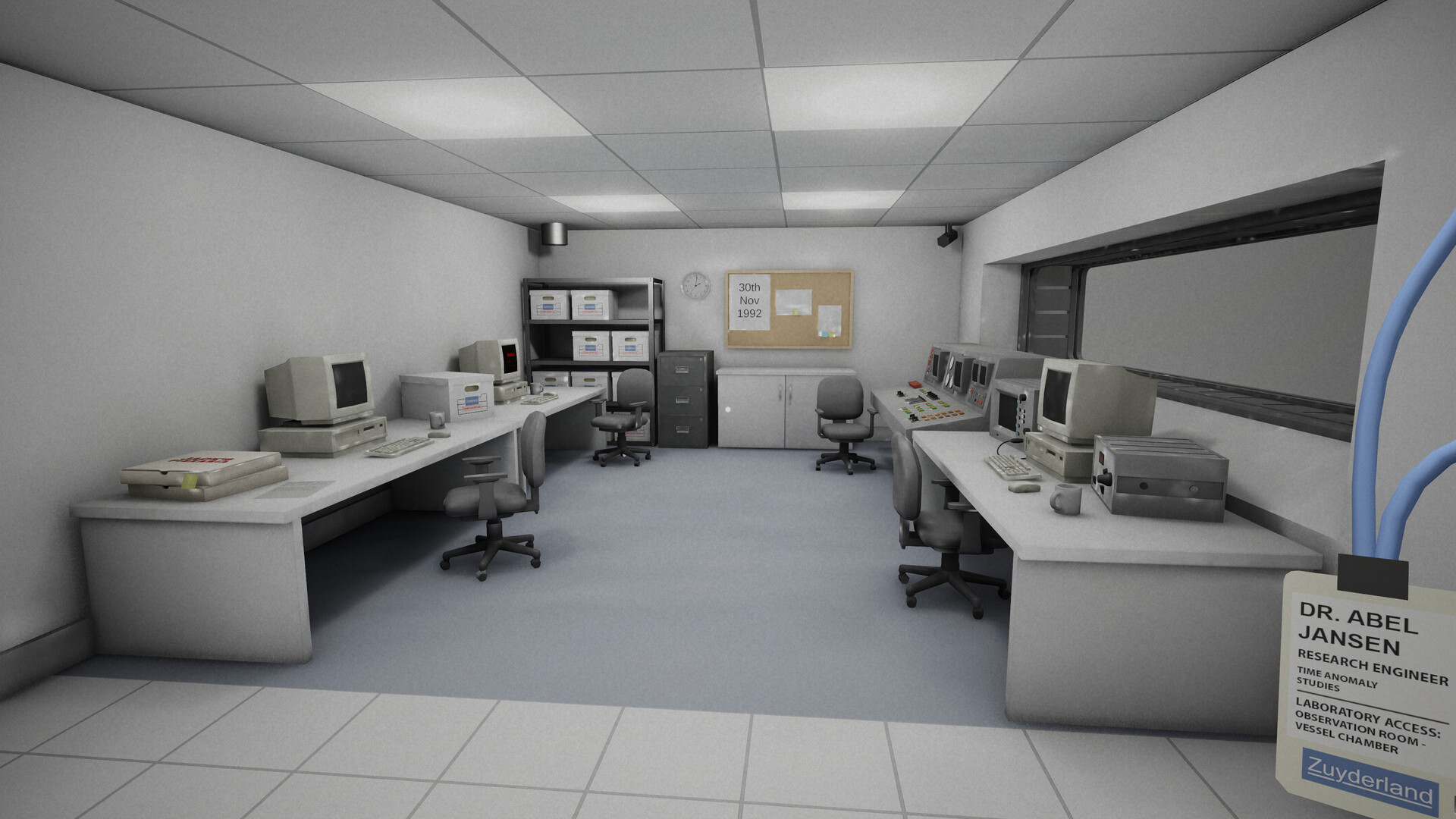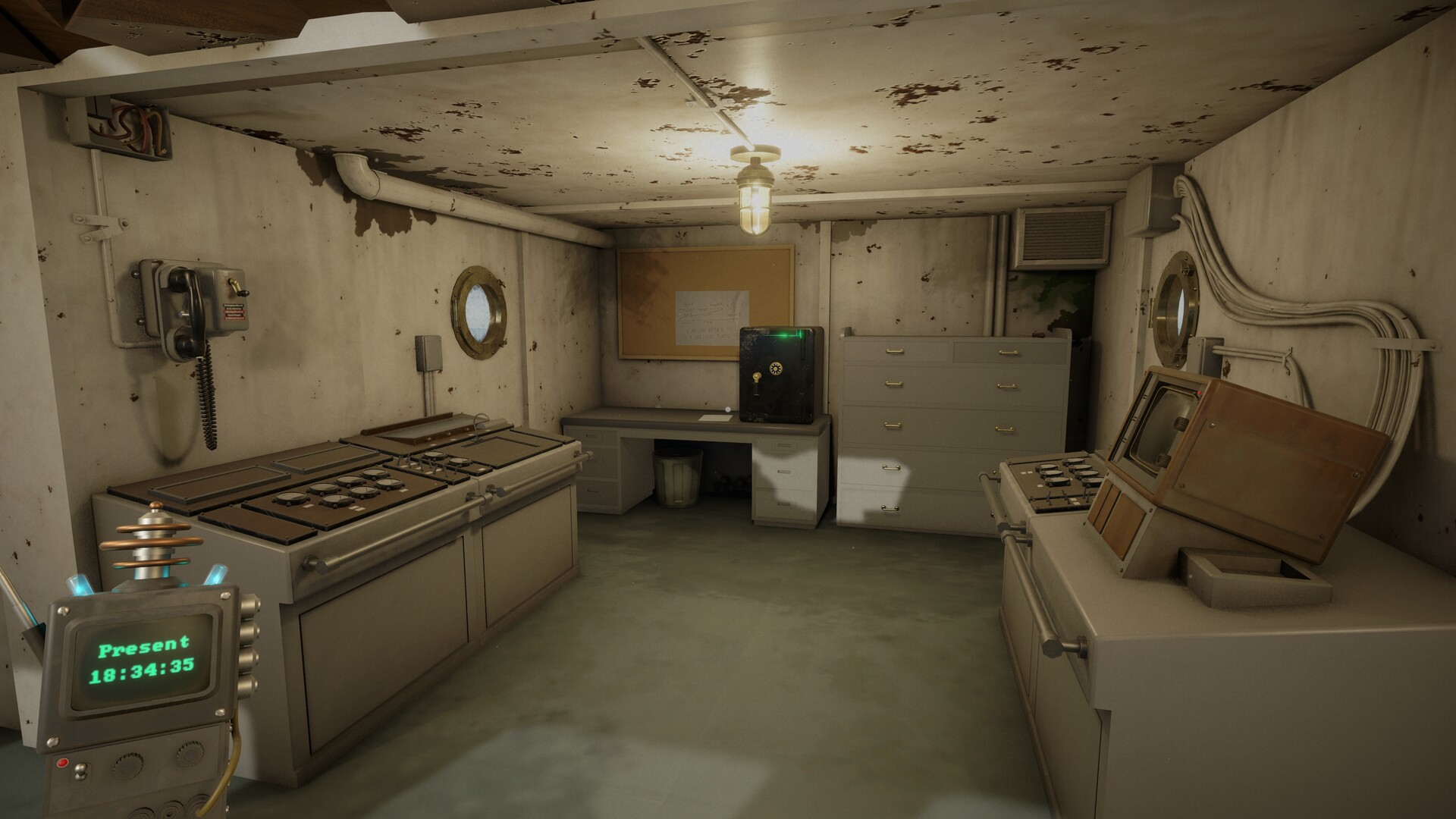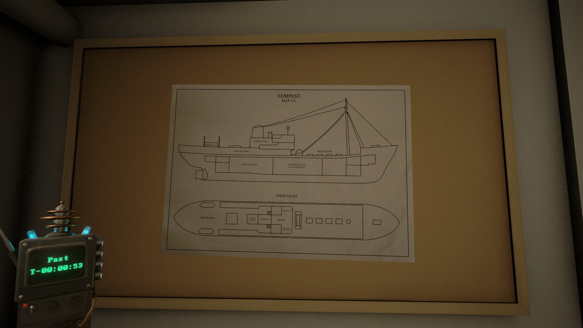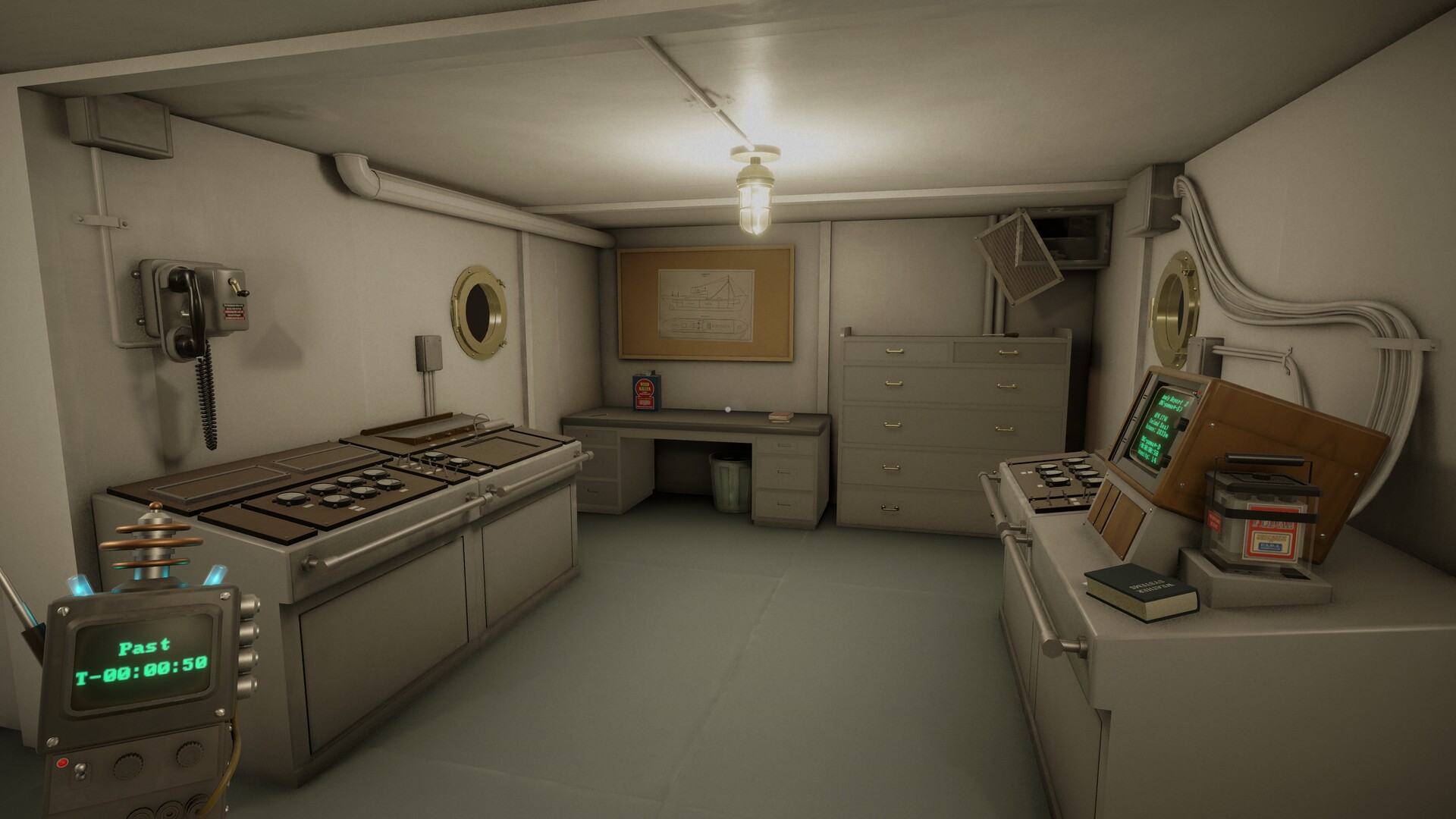 At Eternity's Hatch is a mystery puzzle adventure centred around an evolving time travel system. Stranded at sea aboard a 1950s research vessel in an alternate timeline, you must utilise the ship's time-travel abilities to uncover information, solve puzzles across timelines and alter the past to return home. As the game progresses, you learn the rules governing the time travel system involving multiple timelines and how to use them to your advantage, unlocking new abilities along the way.