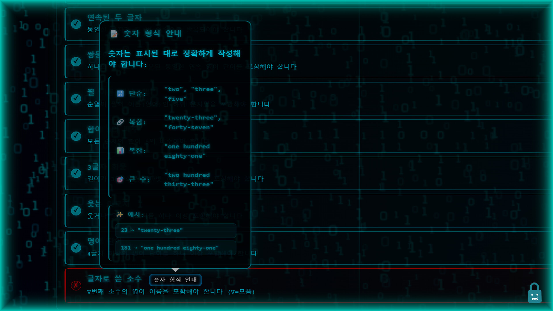 ๋ ผ๋ฆฌ, ์ถ๋ก , ๊ทธ๋ฆฌ๊ณ ์ ํ์ ์ธ๋ถ ๋๊ตฌ๋ฅผ ์ฌ์ฉํ์ฌ 40๊ฐ ๋ ๋ฒจ์ ๊ฑธ์ณ ๋์ ์ ์ธ ํ ์คํธ ๊ธฐ๋ฐ ๋น๋ฐ๋ฒํธ ํผ์ฆ์ ํด๊ฒฐํ์ธ์. ๋น์ ์ ๊ท์น, ๋น์ ์ ๊ฒ์: ๋ค๋ฅธ ์ฌ๋๋ค์ ์ํด ๊ทธ๊ฒ์ ๋ง๋ค์ด๊ฐ๋ ์ฒซ ๋ฒ์งธ ์ฌ๋์ด ๋์ธ์!