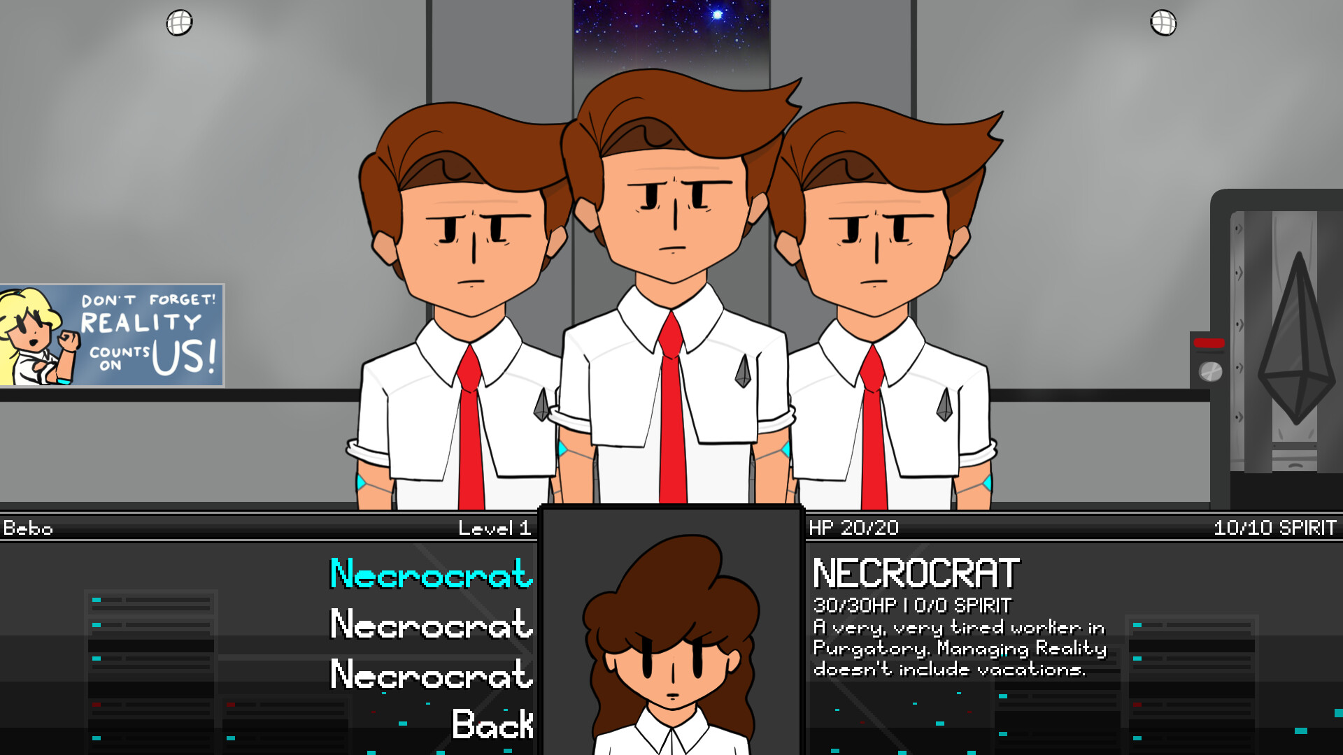 An indie RPG set in the afterlife, through a partly-dystopian, partly-vibrant, and always-dangerous lens. Explore a range of different environments, battle a wide range of enemies, learn an unnecessary amount of lore if you want, and most importantly... Be the bad guy who saves everyone.