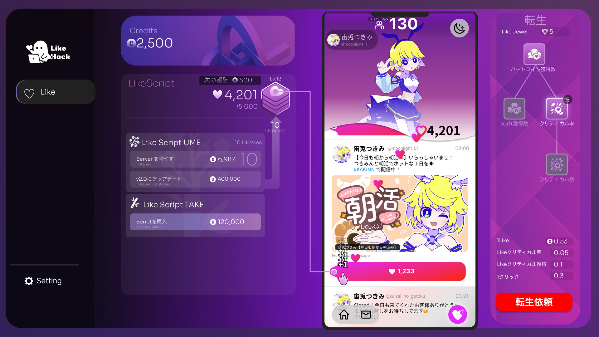 - Reincarnation System: Fusion of VTuber "reincarnation" and idle game "rebirth." Each reincarnation increases SNS power and lets you enjoy new "Tsukimin" appearances and posting styles