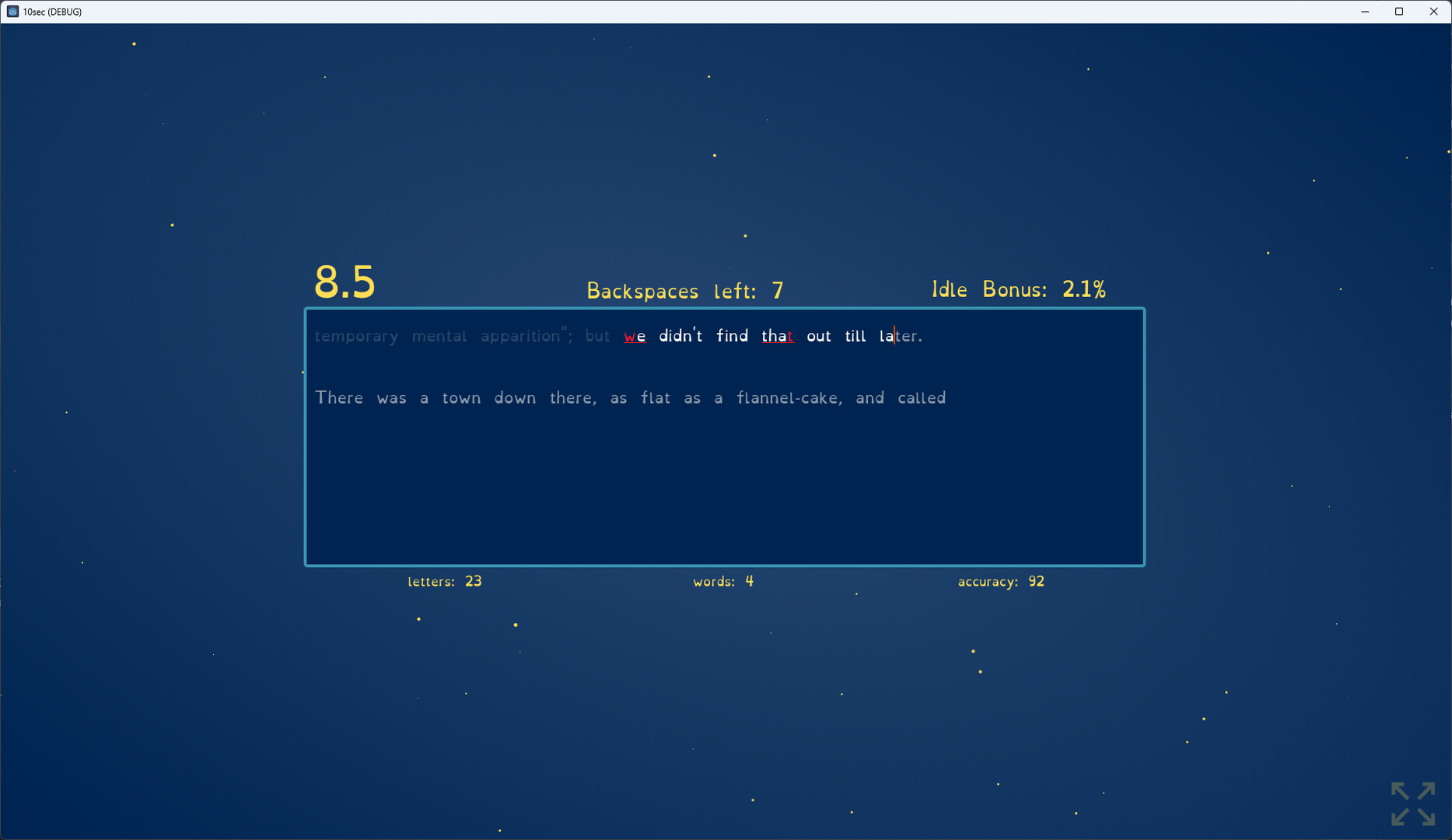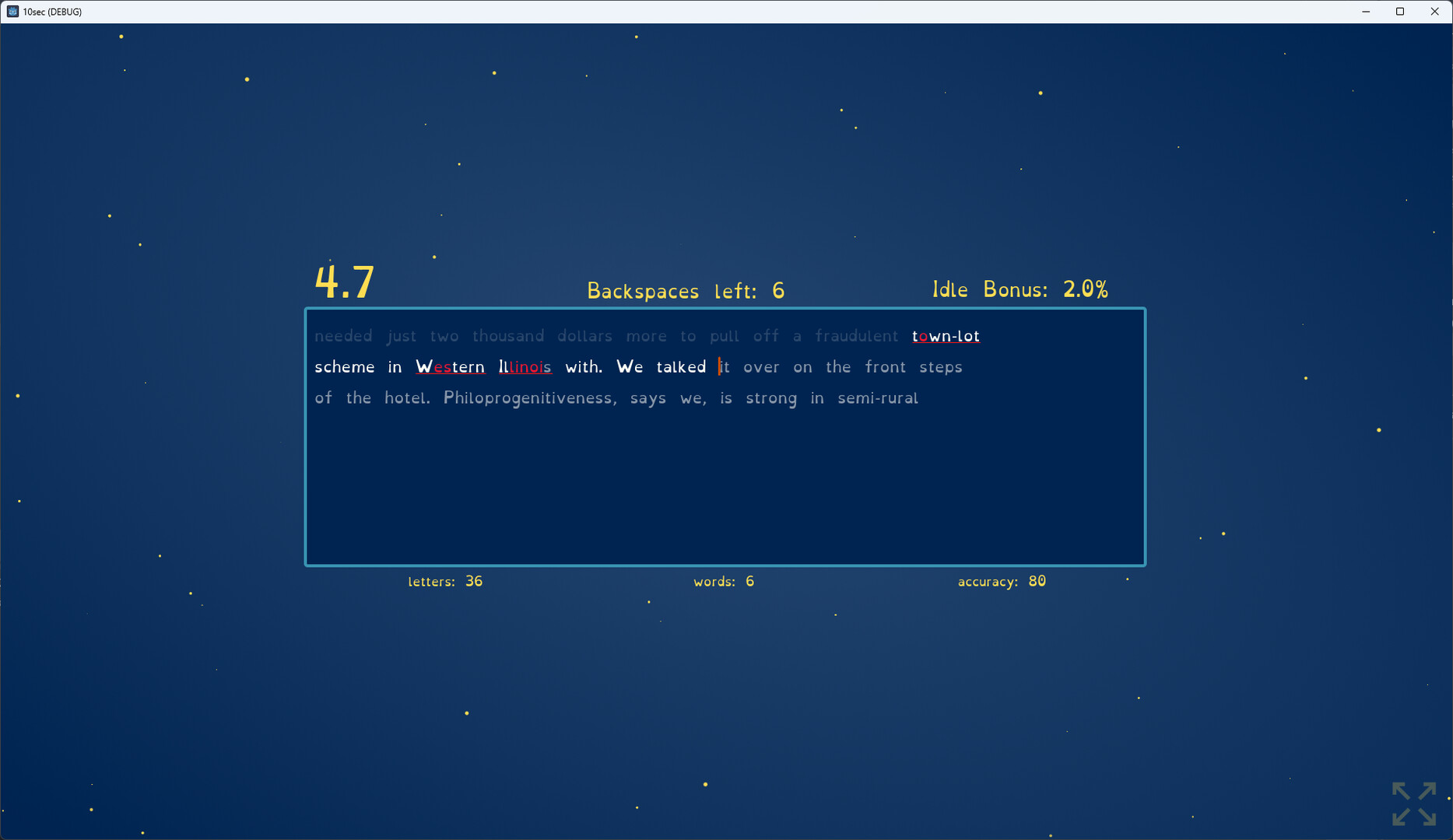 You start by typing as fast as you can for 5 seconds. Then you get a point for each correct letter you typed. These points can be used to buy upgrades. Upgrades can give you additional points, more typing time, accuracy bonuses, and other improvements. Then you type again, earning more points. Soon you’ll be earning hundreds, thousands, or even billions of points.