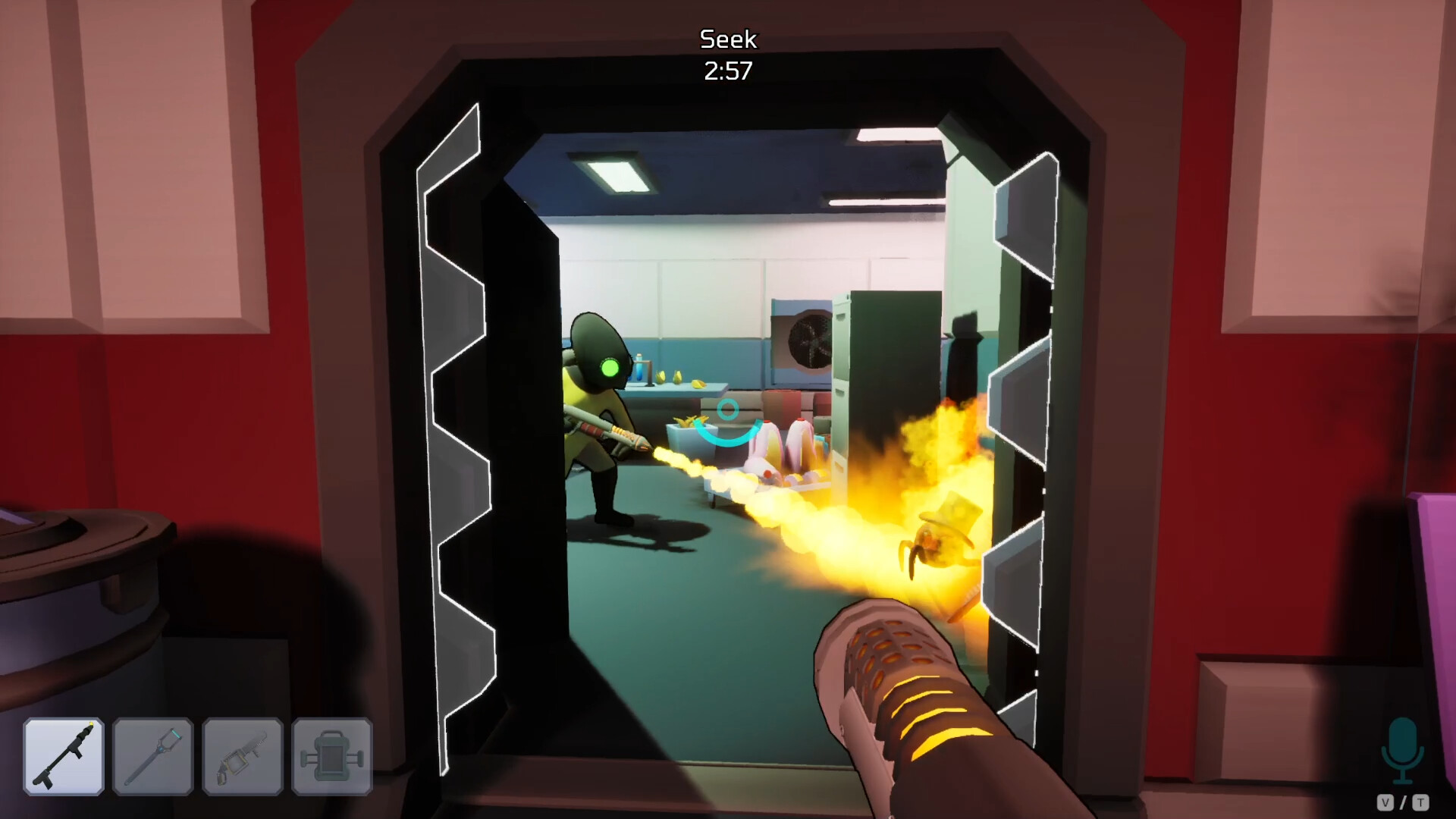 As an Exterminator, use flamethrowers, grenade launchers and a whole arsenal of dangerous weapons to search rooms and flush out any fake furniture hiding there!