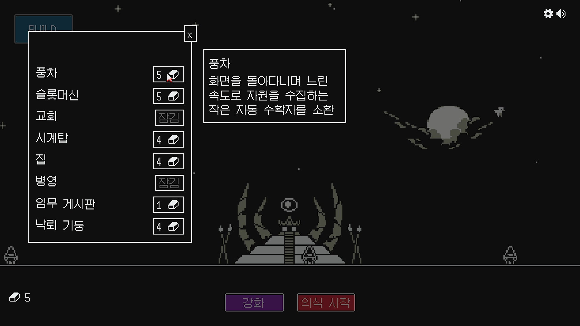 자원을 사용하여 어둠의 힘을 끊임없이 강화하세요. 강화할 때마다 교단이 눈에 띄게 거대해지고, 수확 효율은 광기 어린 속도로 빨라지며, 희생 범위는 공포스러울 정도로 넓어질 것입니다... 하지만 주의하세요. 우상의 굶주림 또한 계속해서 자라납니다...