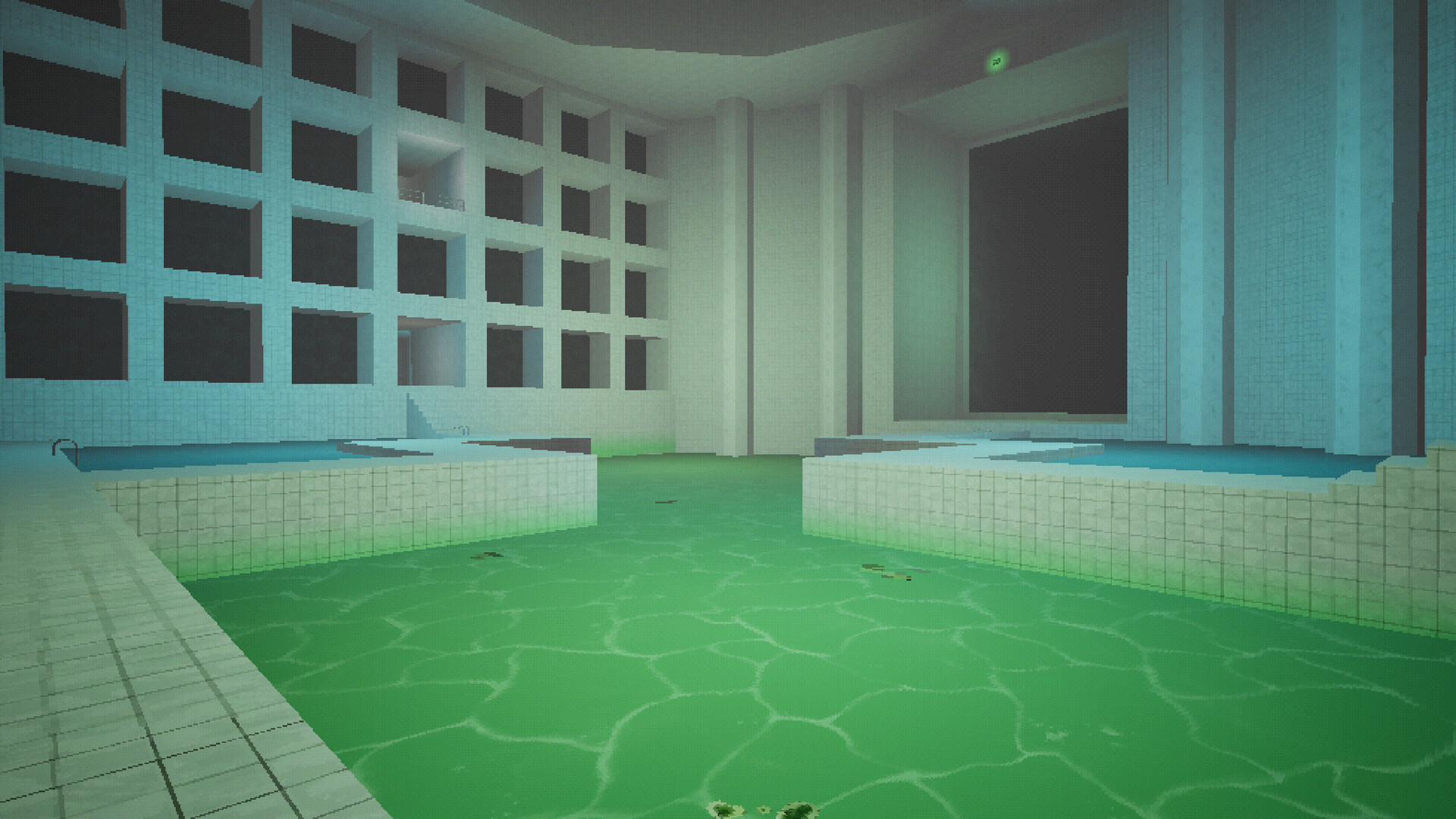 Level 2: Brutalist Poolrooms - In this level, you’ll find yourself in a huge concrete facility that is impossibly vast. The large industrial walls may evoke a feeling of megalophobia, as this is the largest and most expansive environment in all of Poolscape.