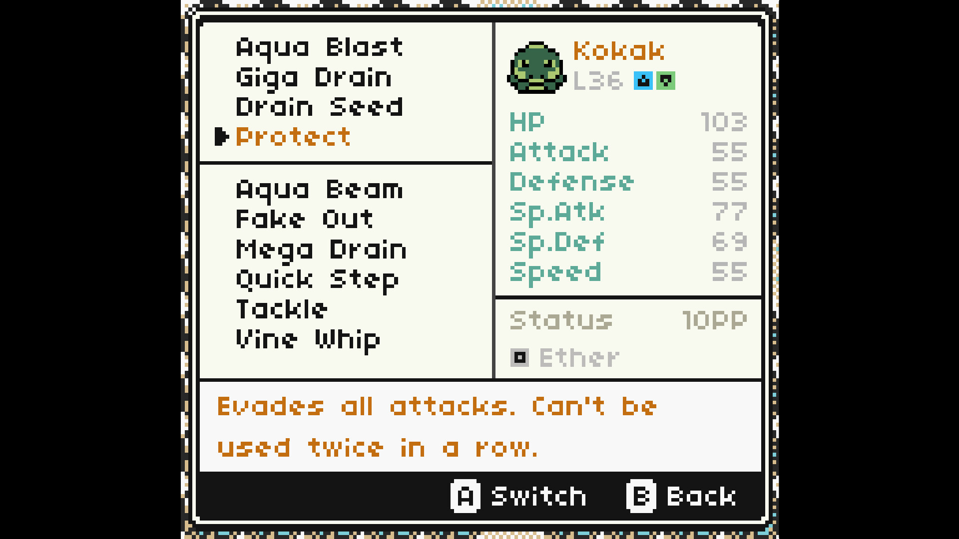 The move selection screen clearly displays type matchups, aiding your decision-making without requiring you to memorize external charts.