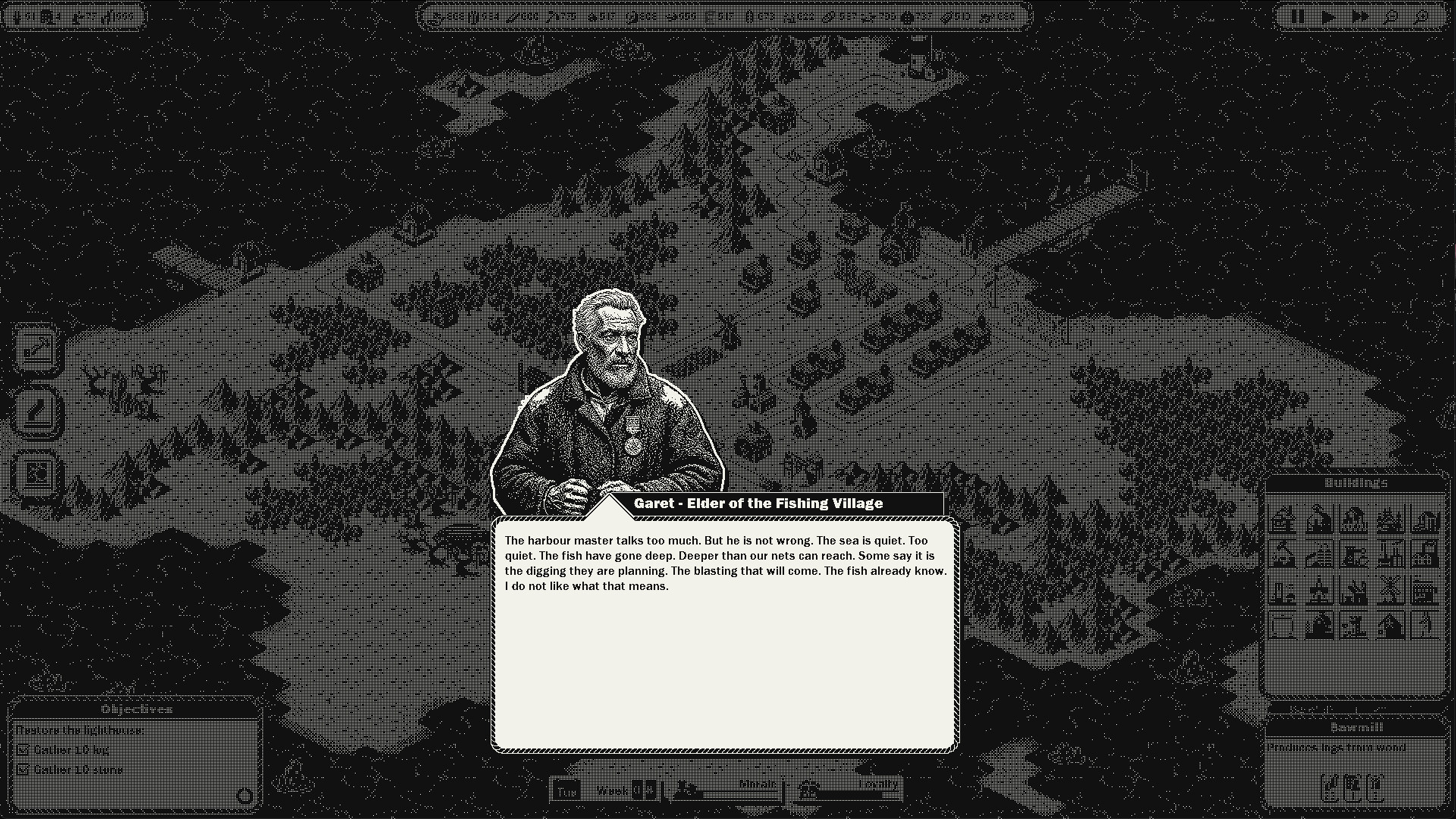 GlagStone is a story-driven city-building game set on a remote island caught between warring nations — brought to life in a striking black-and-white style.