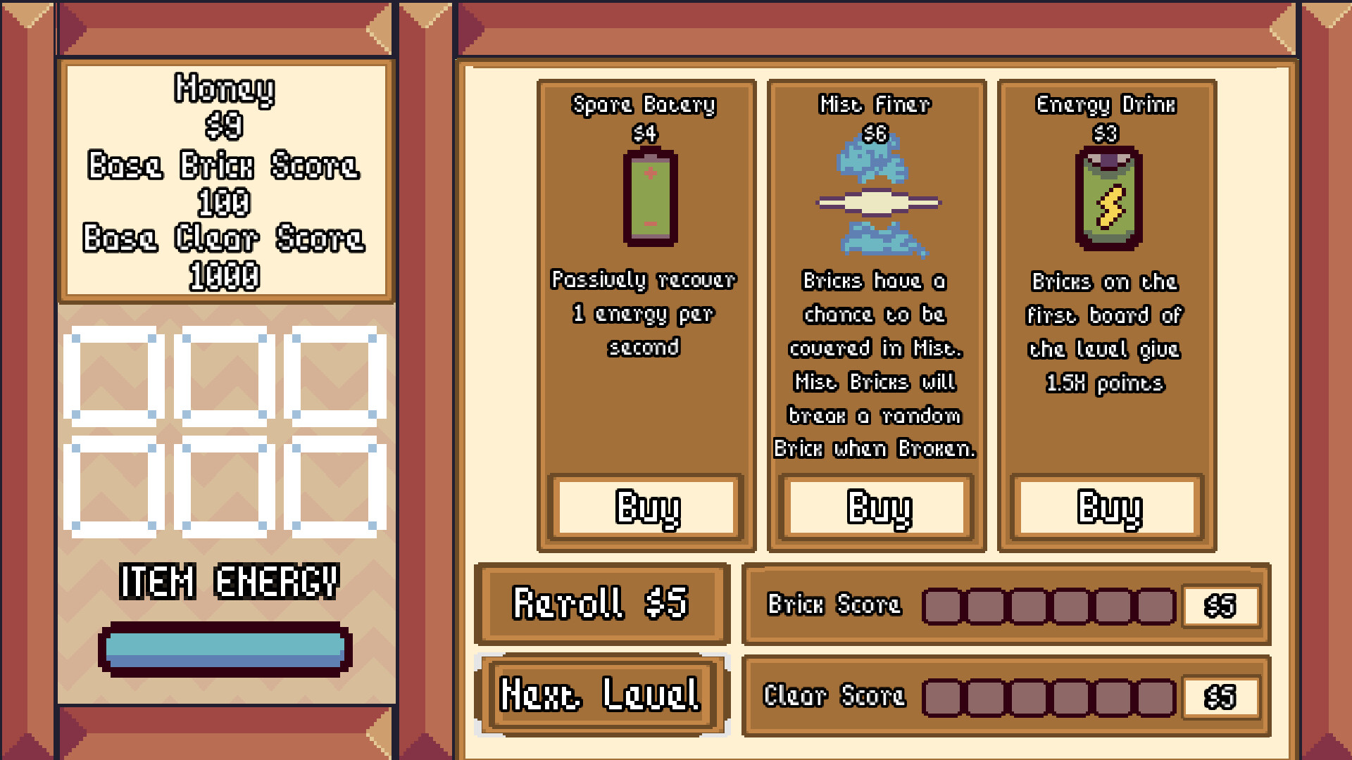 Break, blast, and crash through this arcade style Rgouelike. Assemble the perfect item set and leave no brick standing.