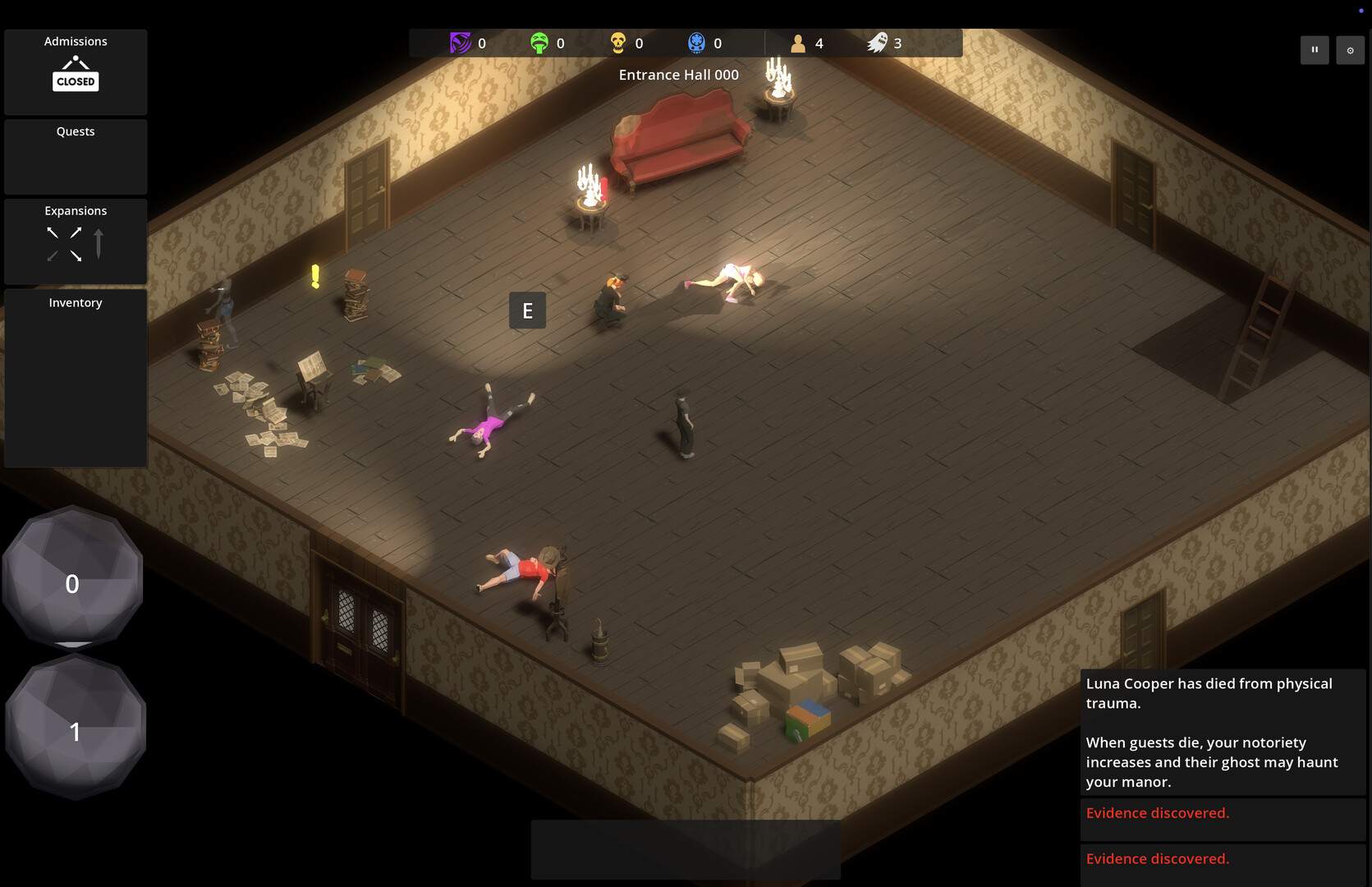 Guests die, and that draws warranted, but unwanted, attention. A faceless institution sends inspectors to walk your halls, count your bodies, and ask questions. Maybe they discover the skeleton hidden in a closet, or maybe they discover the corpse just lying out in the hallway. How you handle them determines how much freedom you have left.