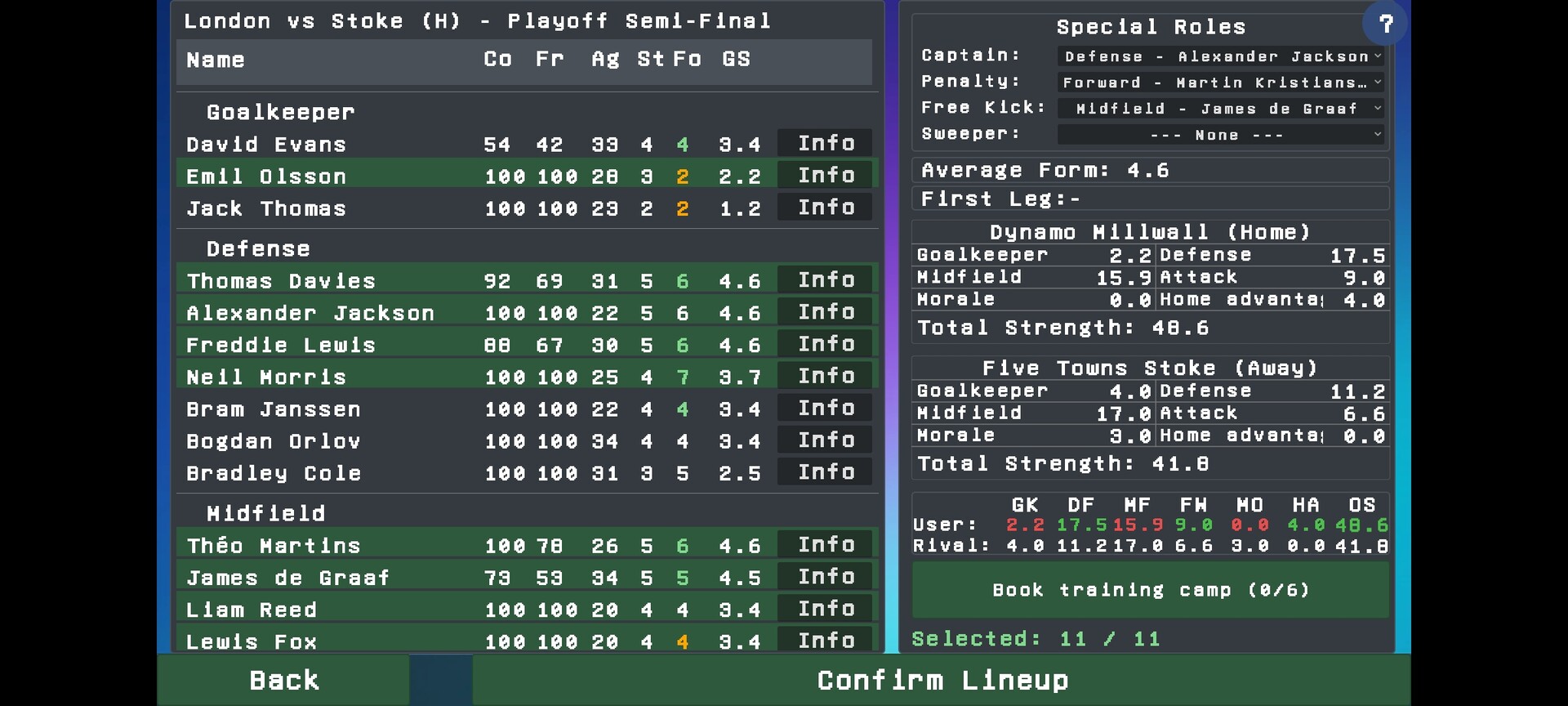 - Training: 9 areas: free kicks, penalties, tactics, conditioning and more