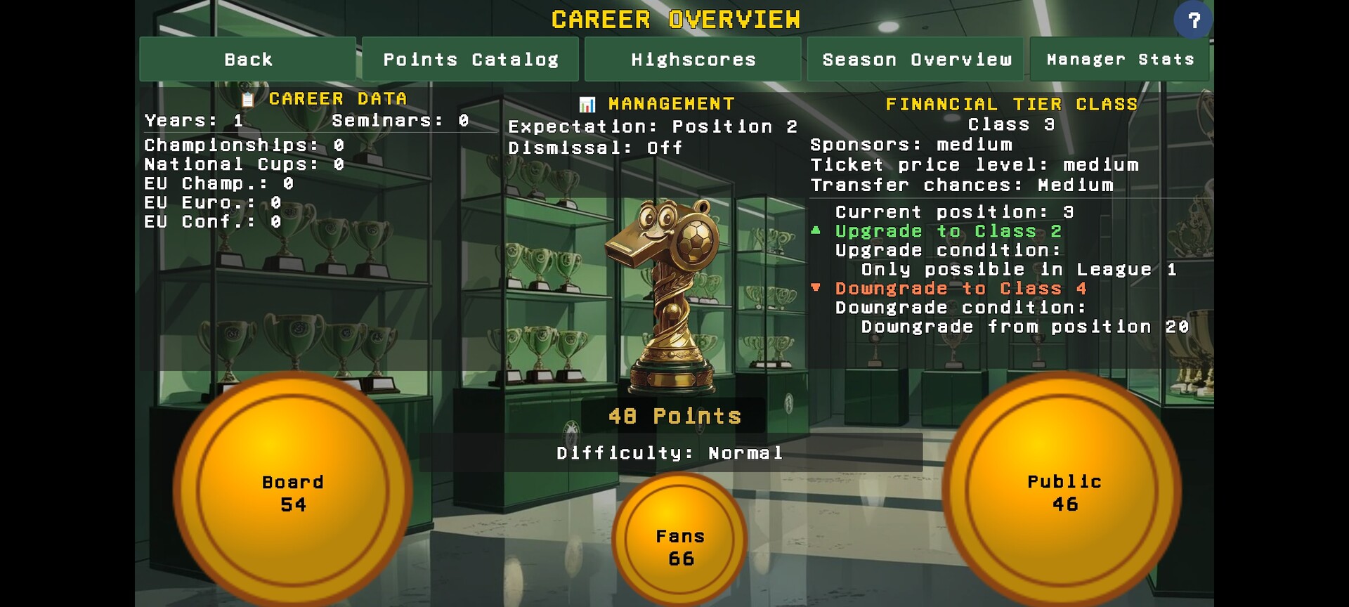 - Stadium: 8 stand types, floodlights, pitch heating, VIP boxes