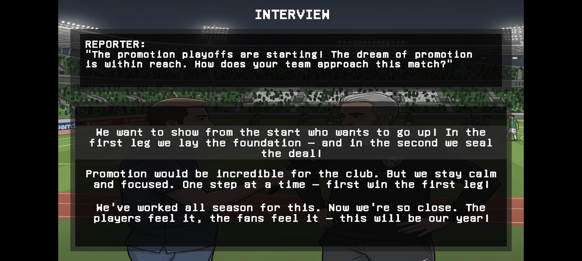 - Your answers affect morale, finances and player development