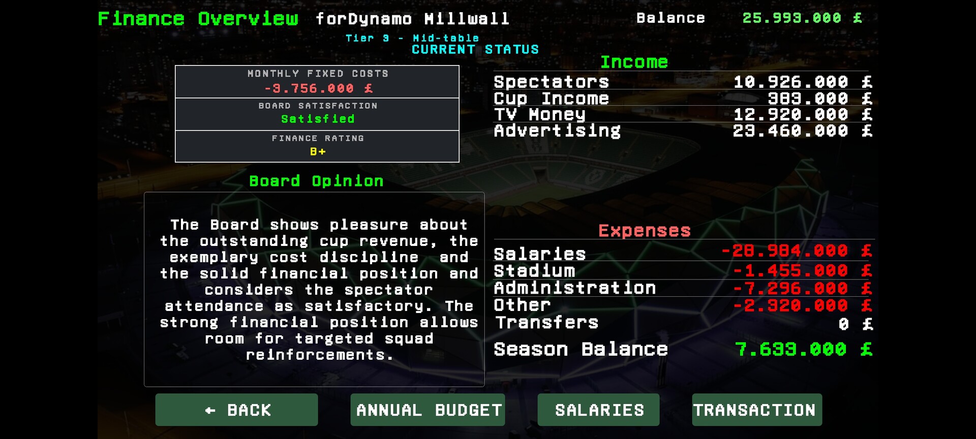 - Finances: TV revenue, sponsoring, ticket prices, full ledger