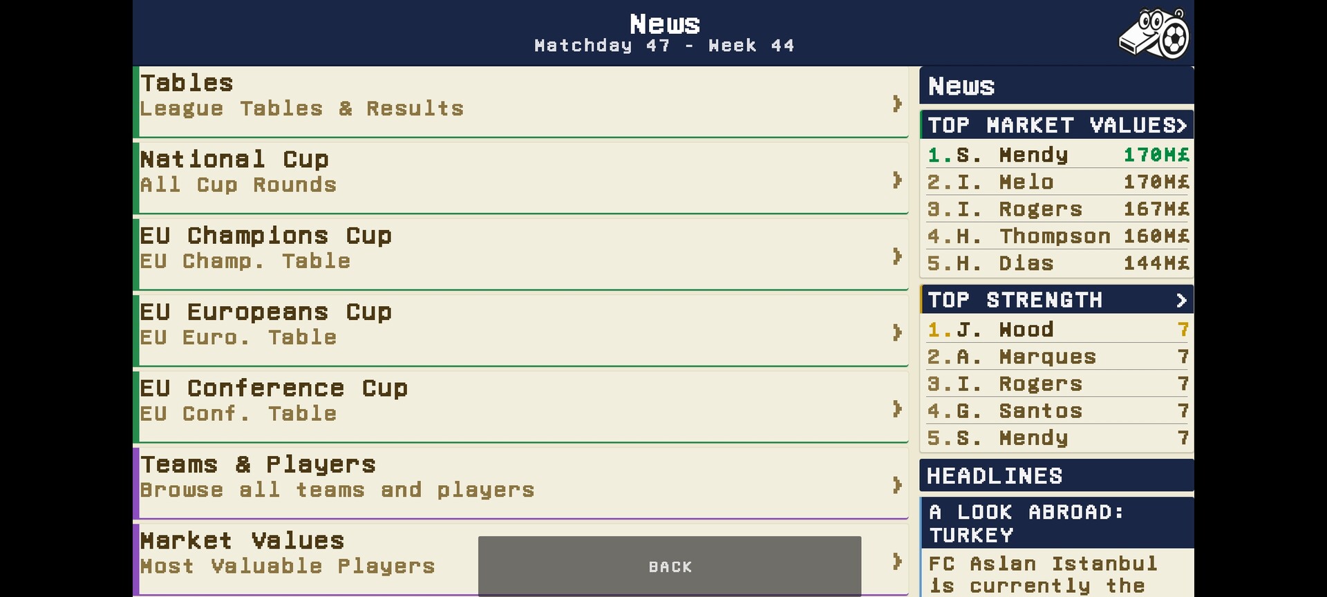 A 90s-style retro football manager. Pick a club in Germany, England or Turkey, negotiate transfers, set tactics, expand your stadium, survive interviews and build a 10-season career across leagues, cups and European competitions. Cloud save, online leaderboards, database editor. Free to play.