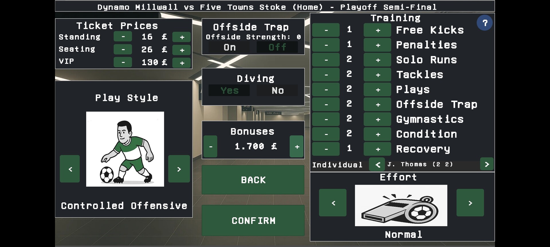 - Tactics with offside trap, man-marking and play styles