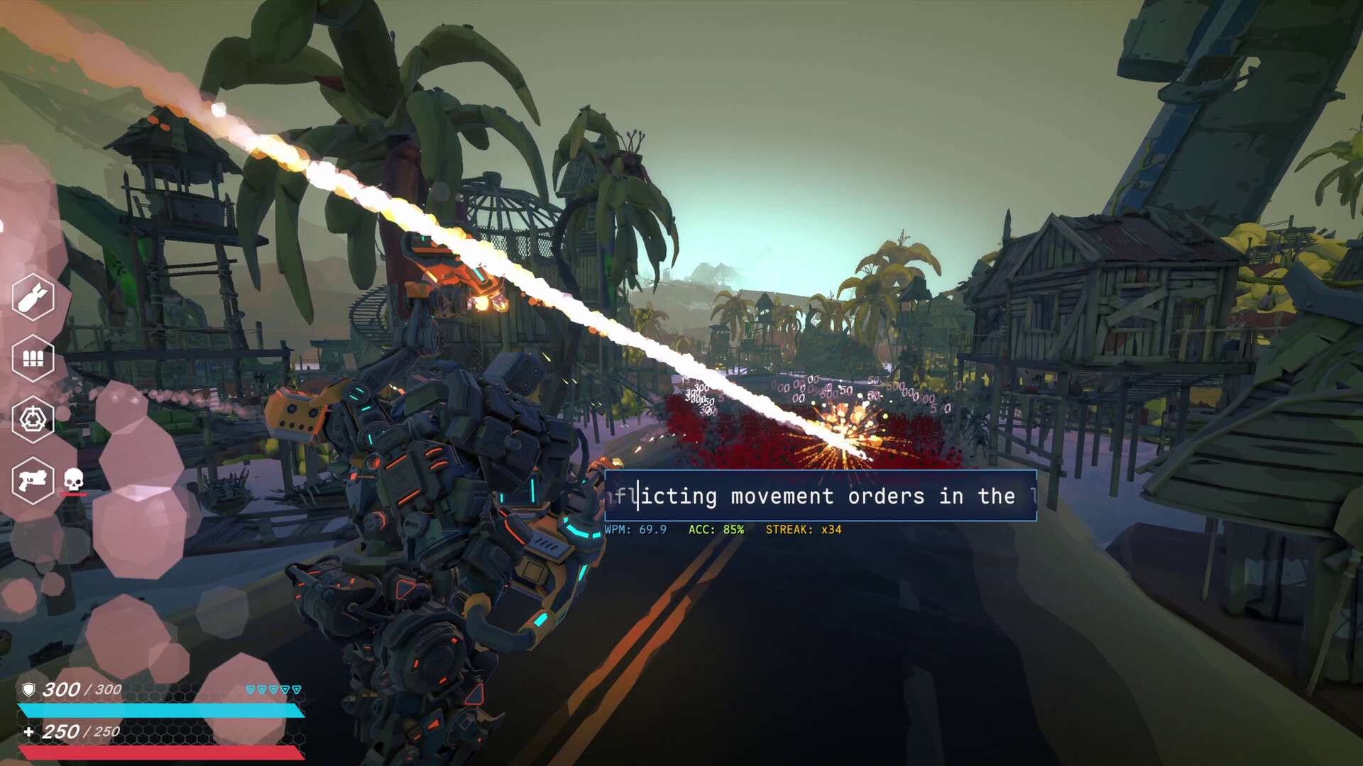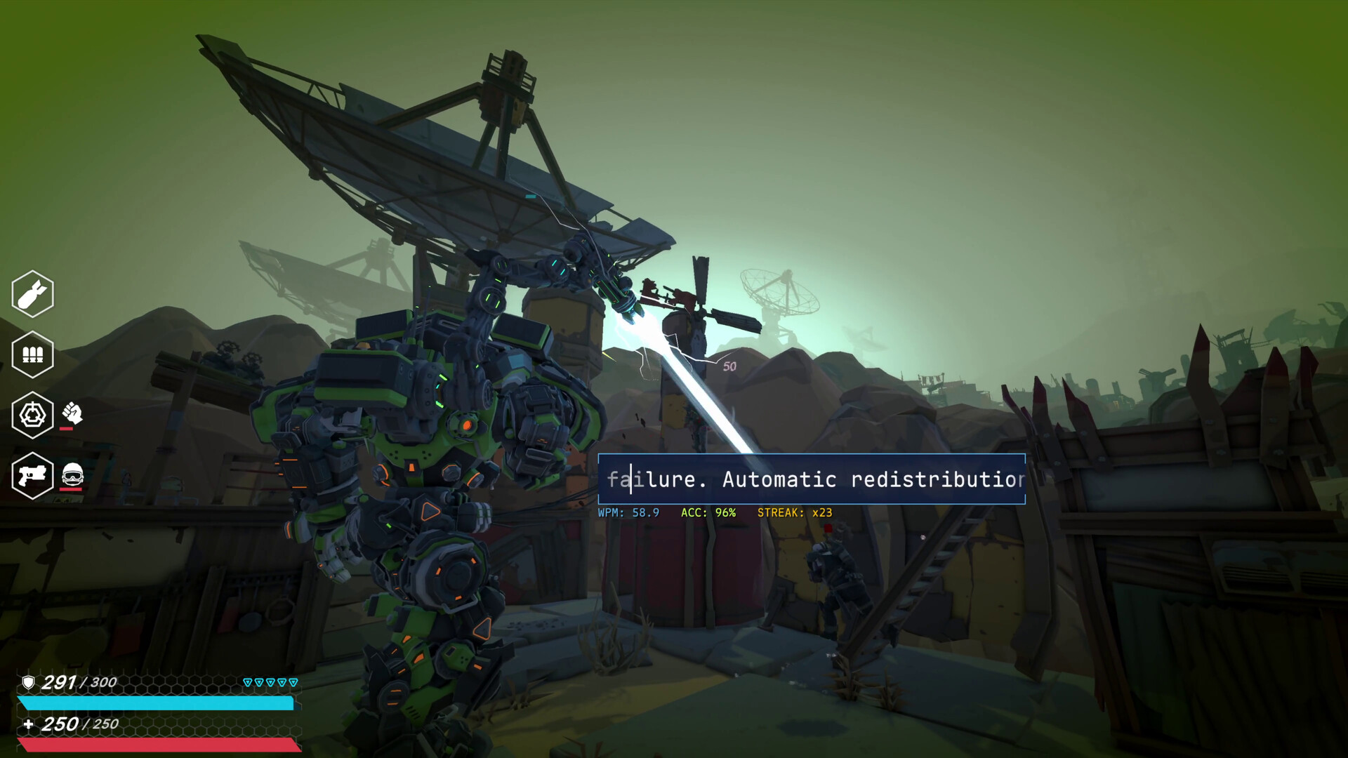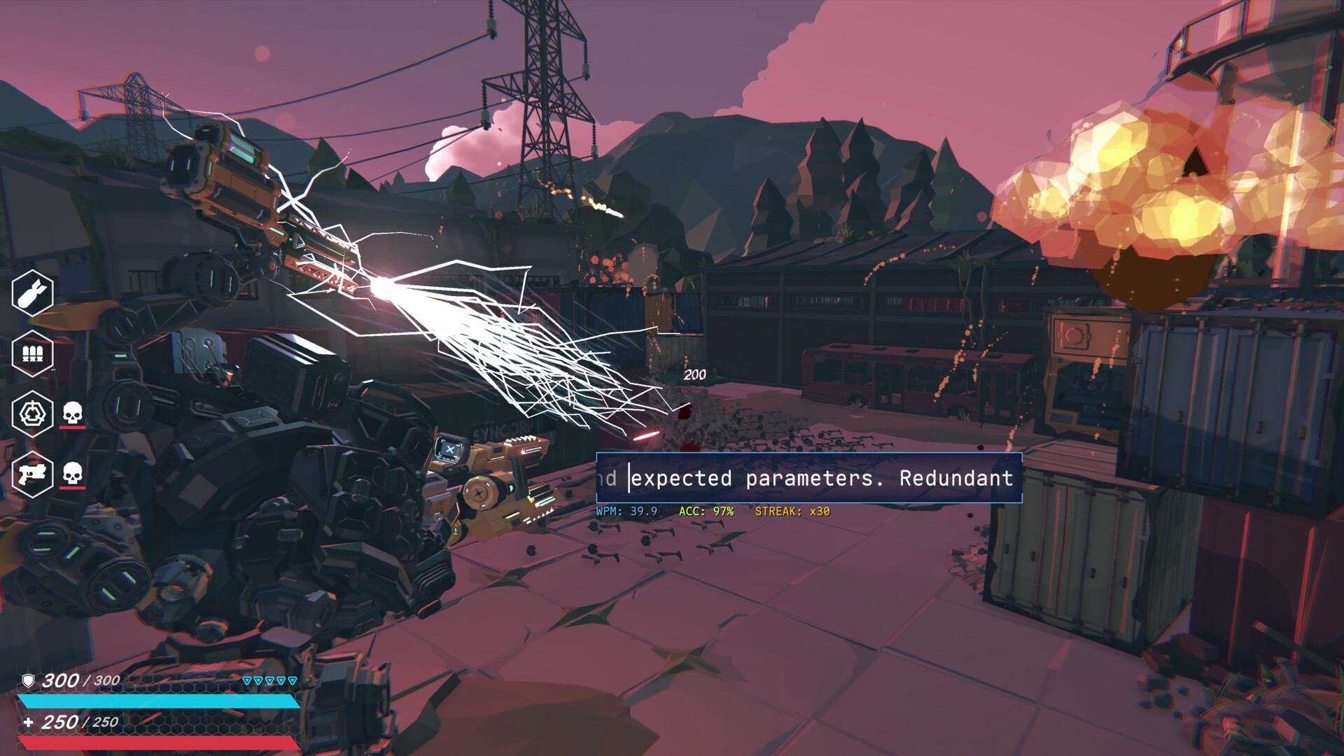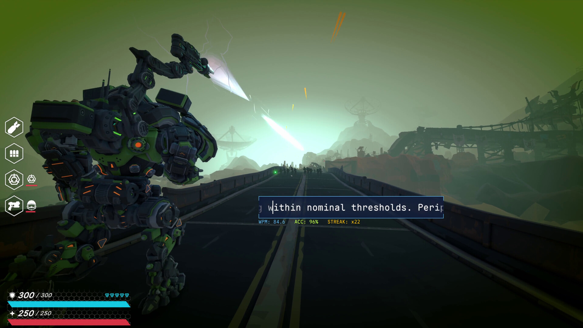 Use your keyboard to unleash a torrent of gunfire and destruction, cutting your way through huge hordes of enemies. Customise and upgrade your mech with new weapons and abilities, make builds that complement your loadout and typing style as you lay waste to the wasteland in a world left in ruins.