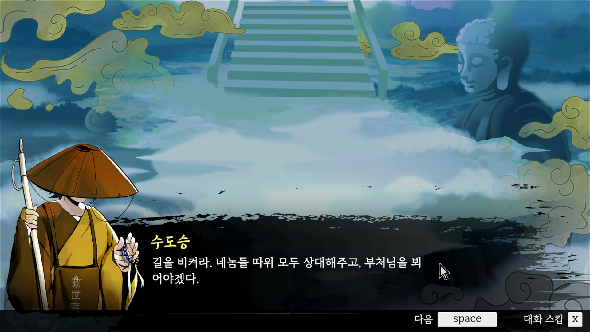 WASD와 방향키를 함께 사용하는 독특한 구조의 리듬게임입니다. 이를 ‘8방향에서 다가오는 적과 전투하는 수도승’이라는 테마로 구현했는데, 전투하는 느낌이 잘 살아있고 그로인해 리듬게임으로서 타격감이 잘 살아 있습니다. 튜토리얼, 초반에는 엄청 쉽다가 중간에 난이도가 중상~상으로 넘어가는 구간에서 체감 난이도가 갑자기 뛰는 느낌이 있어서 살짝 당황스러웠지만 전반적으로 난이도는 적당한 거 같아요. 스토리도 소소하게 재밌고, 변속이나 두번 누르는 노트 등등 리듬게임으로서의 기믹 역시 준수한 잘 만든 게임입니다.