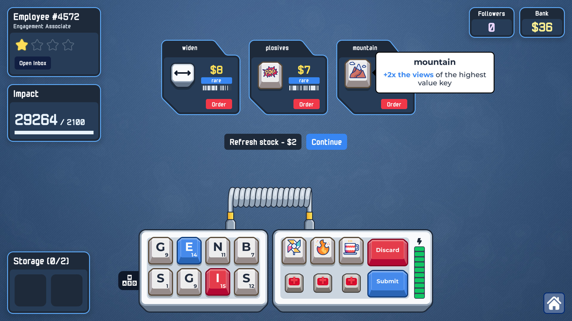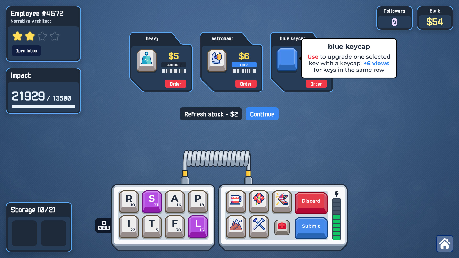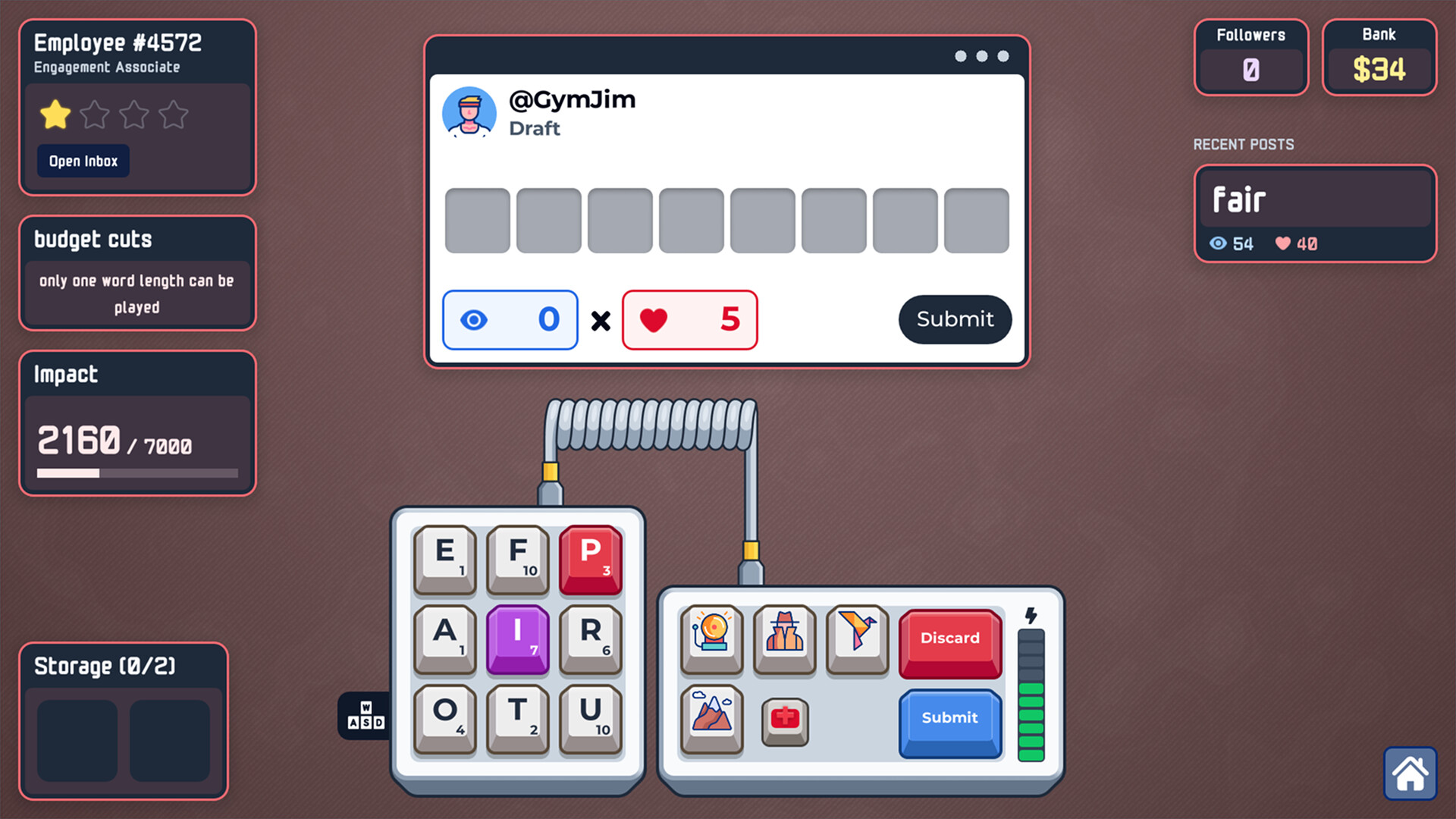 Deck out your keyboard with powerful upgrades in this roguelike word-builder. Snap on keycaps to buff entire rows or columns, install "broken" function keys, and pick your projects as you rise from a lowly intern to a corporate legend.