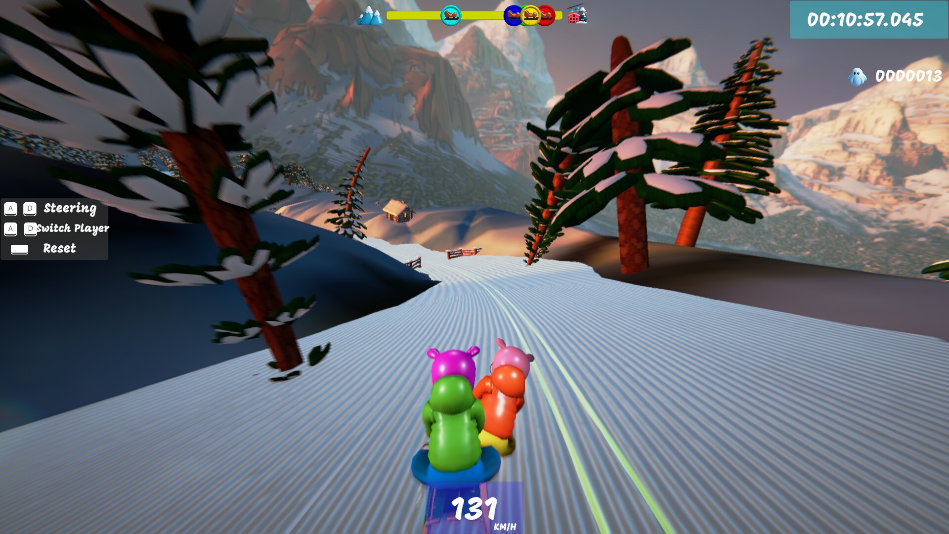 Race down icy slopes packed with sharp turns and unforgiving obstacles. A fast, chaotic co-op game built for speedrunners and friendship stress-tests.