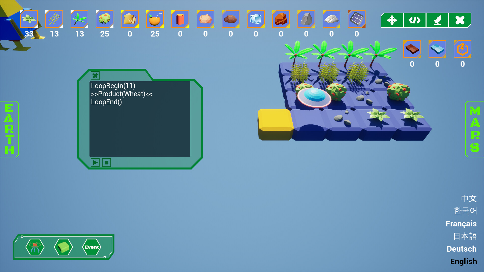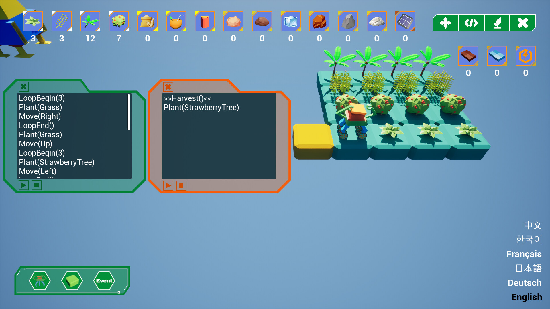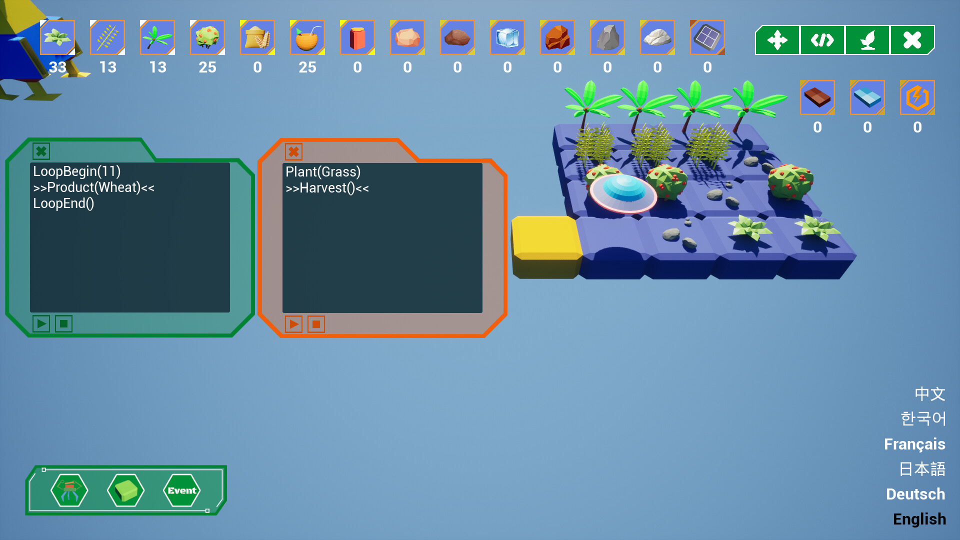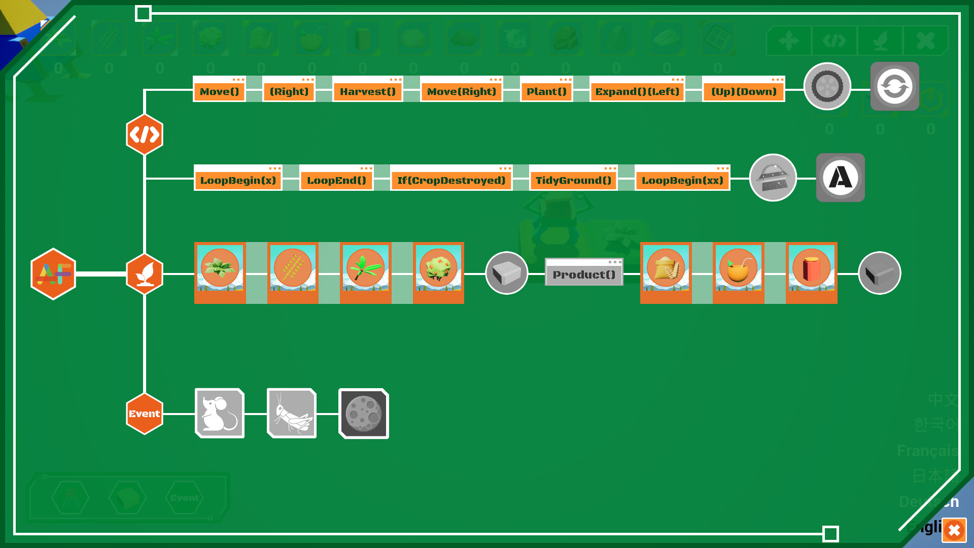 이 게임은 프로그래밍 방식을 사용하여 농장 시뮬레이션 관리를 하는 게임입니다. 플레이어는 경제를 발전시키고 기술을 업그레이드하며 더 고급스러운 명령과 자원을 해제하여 다양한 불확실한 파괴 사건에 대처해야 합니다. 이를 통해 플레이어는 코드와 사고로 로봇을 제어하여 작물을 수확하고 농장을 관리하는 완전 자동화된 프로세스를 경험하게 됩니다. 게임은 프로그래밍의 복잡성을 단순화하고 자동화 요소를 추출했습니다.