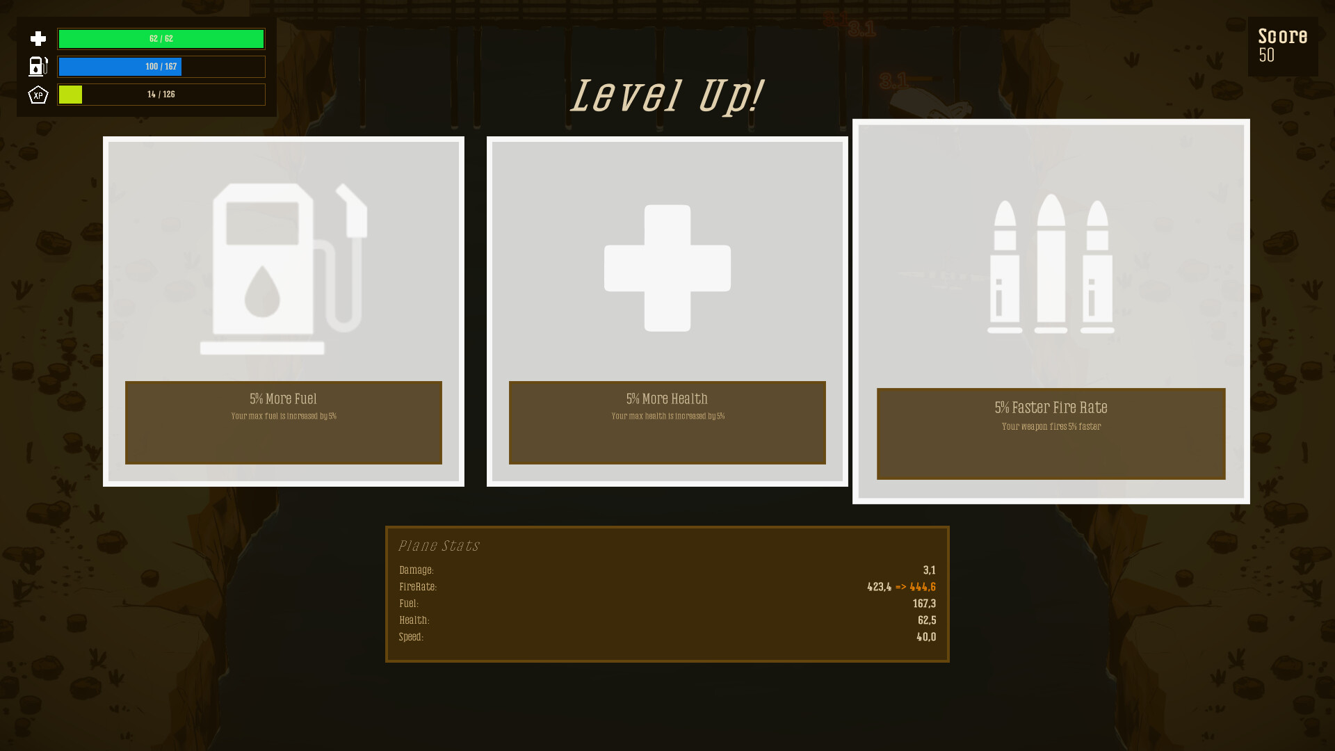 In-Run Upgrades: Destroy enemies, collect XP, and choose from tiered upgrades (1-5 tiers) during each flight