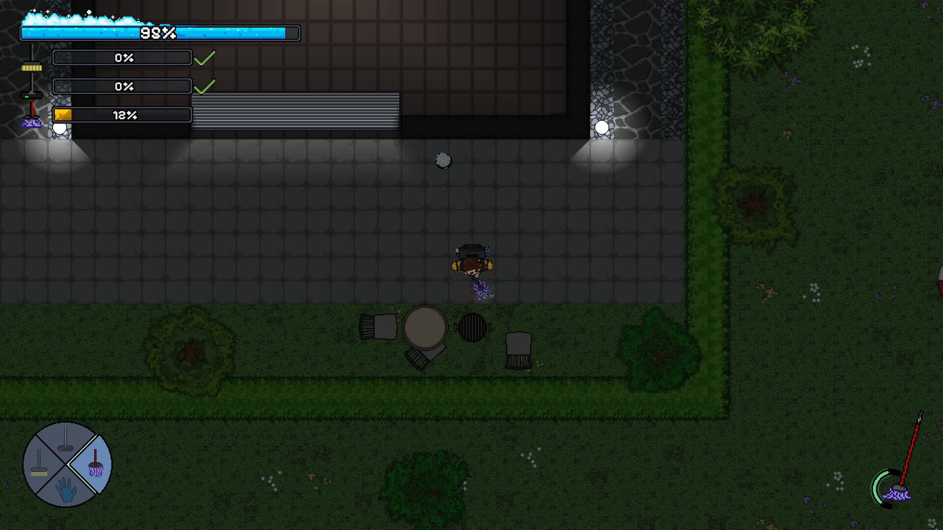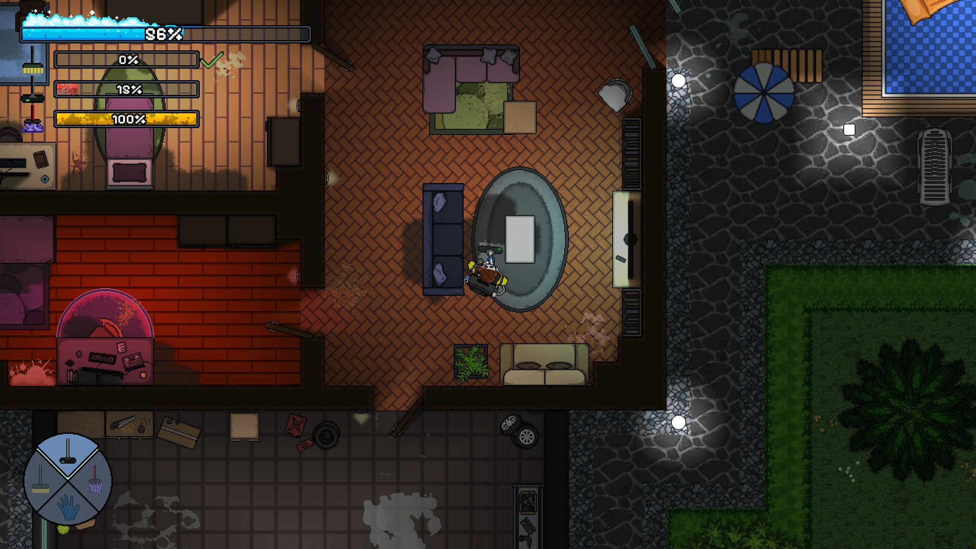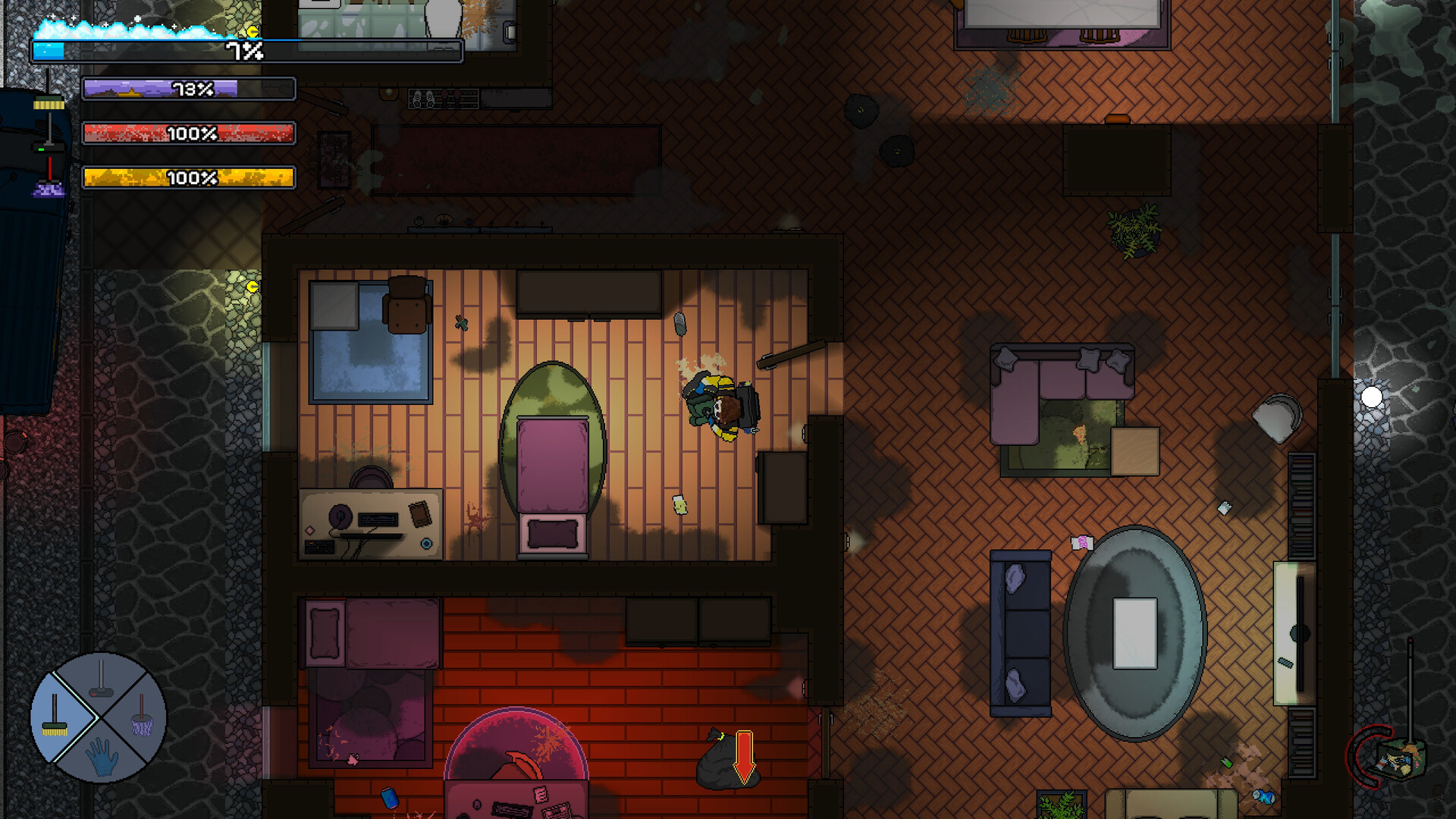 Contract Cleaner는 2D 픽셀 아트 탑다운 시점의 청소 시뮬레이션 게임입니다. 작은 청소 회사를 운영하는 Hank Bucket으로 플레이하며 밤마다 계약을 맡으세요. 쓰레기를 쓸고, 진공청소기로 먼지를 빨아들이고, 대걸레로 얼룩을 닦아내세요.