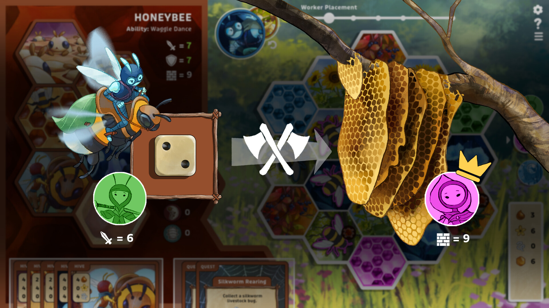 Acquire victory points by completing quests, growing your colony, or amassing resources—but be prepared to defend your spoils from other players and wasps!