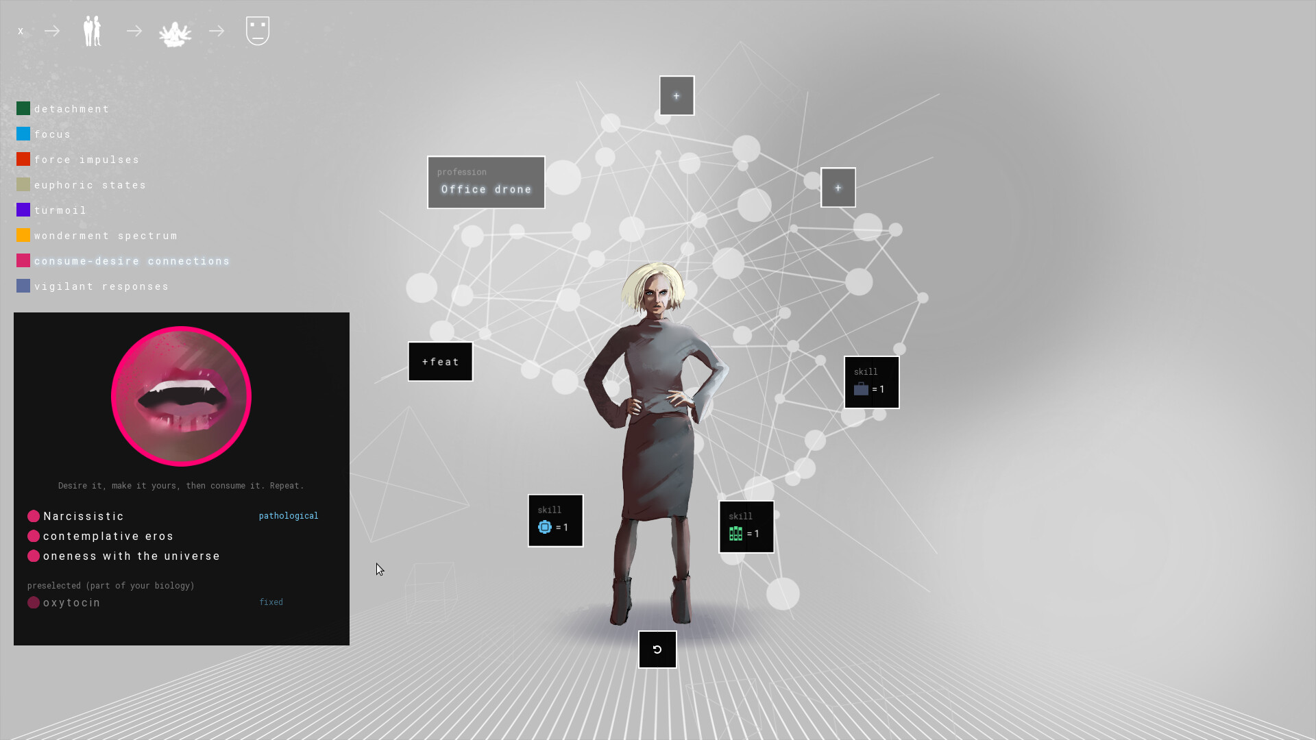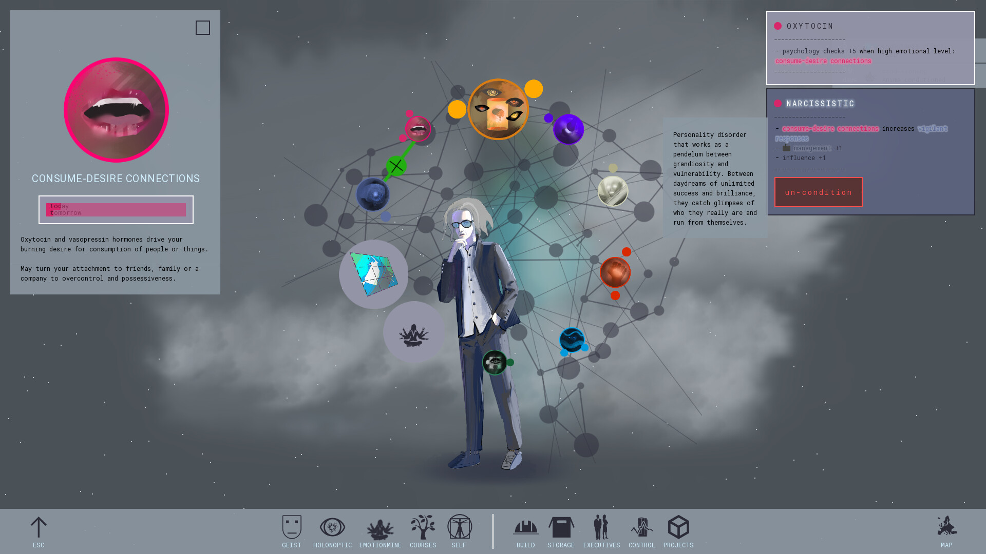 Drink coffee to increase your focus, evolve your brain with paranoia or euphoria, use your emotions in speech checks against other characters.