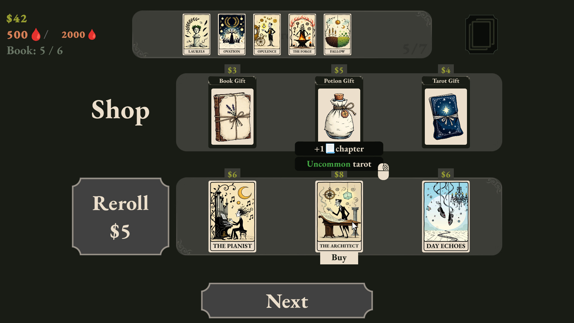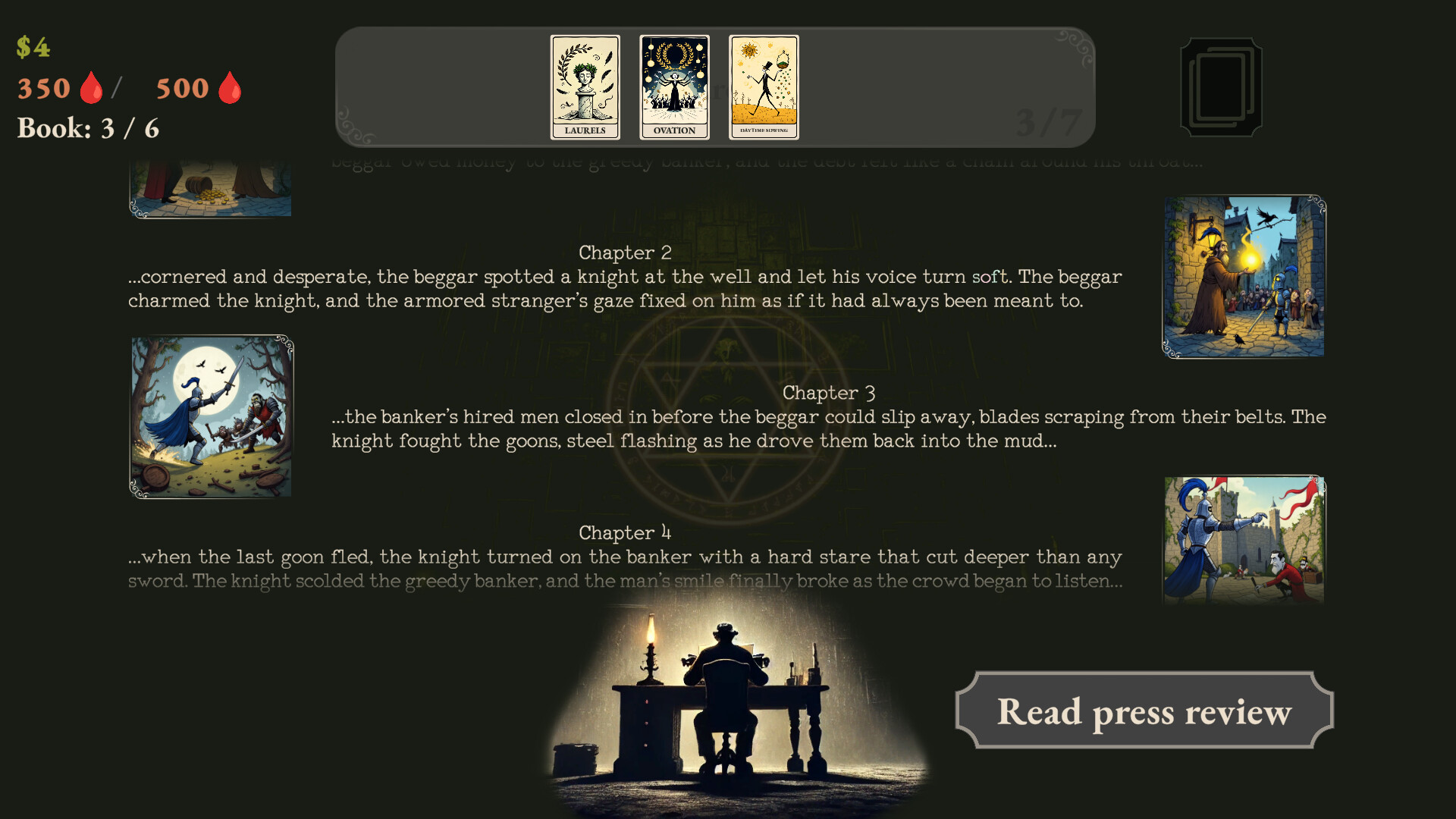 A roguelike deckbuilder where you shuffle word cards to craft sentences and build stories. Youโve partnered with a mysterious Ghostwriter ๐ฟ who provides the talent you lack, helping you chase the fame youโve always wanted.