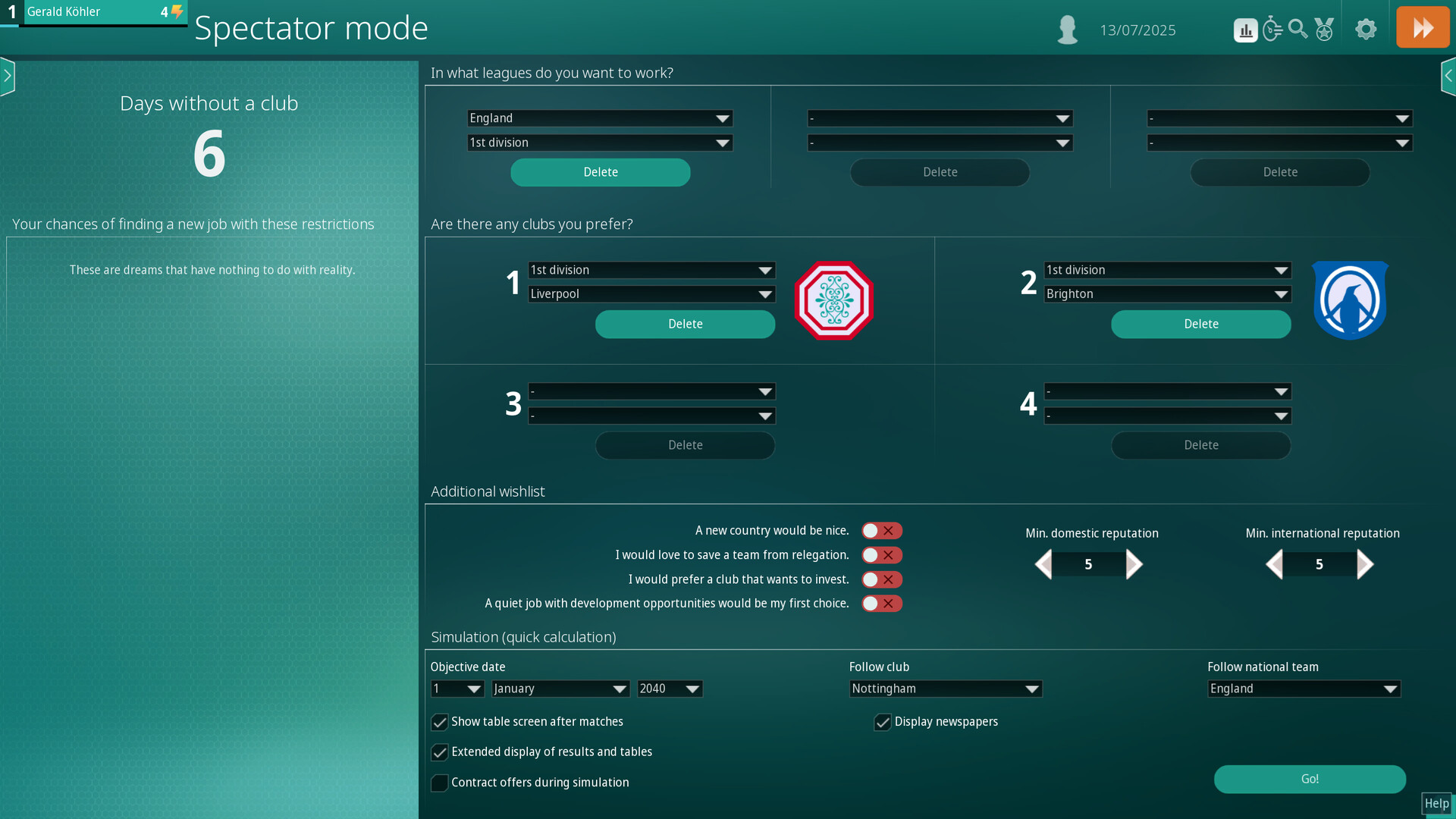 · Spectator mode, in which you can follow the results of a club and/or national team